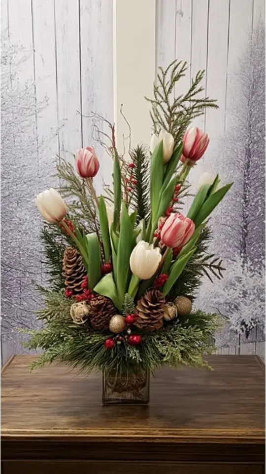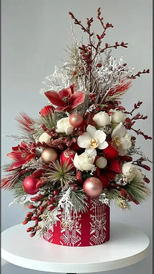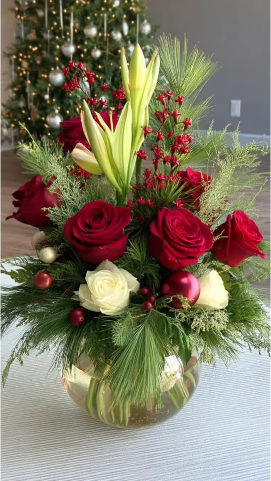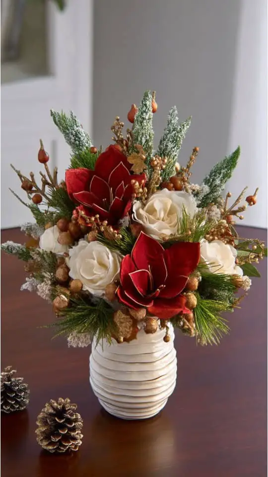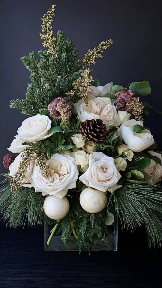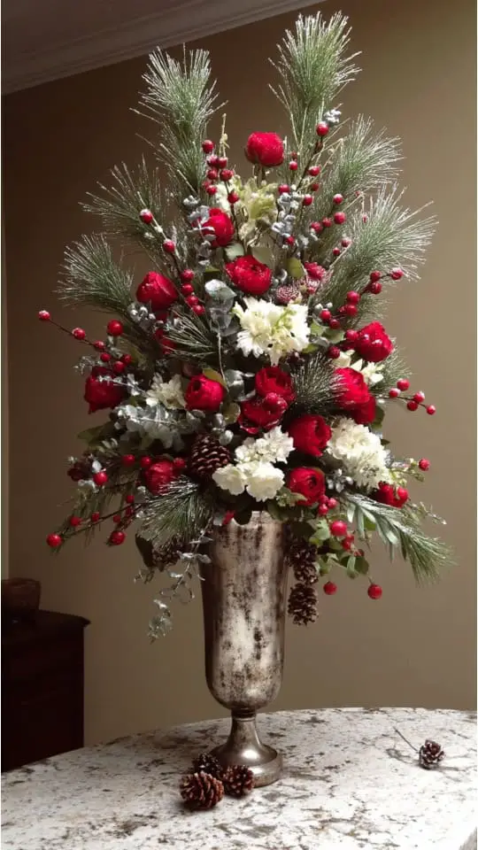I love modern Christmas flower arrangements. Sleek red and white blooms, like roses or mums, pair beautifully with pine. These simple designs feel fresh and stylish during the holidays.