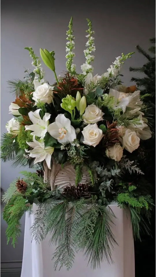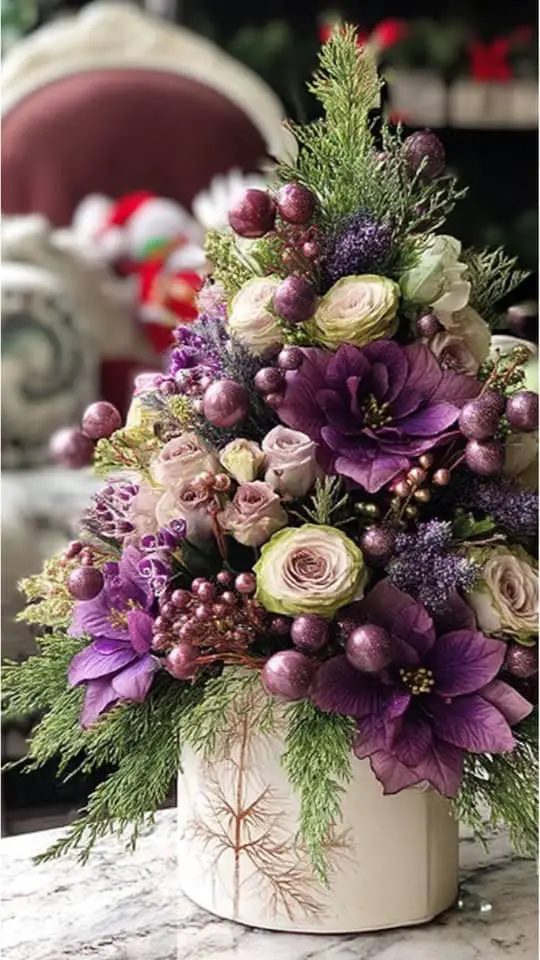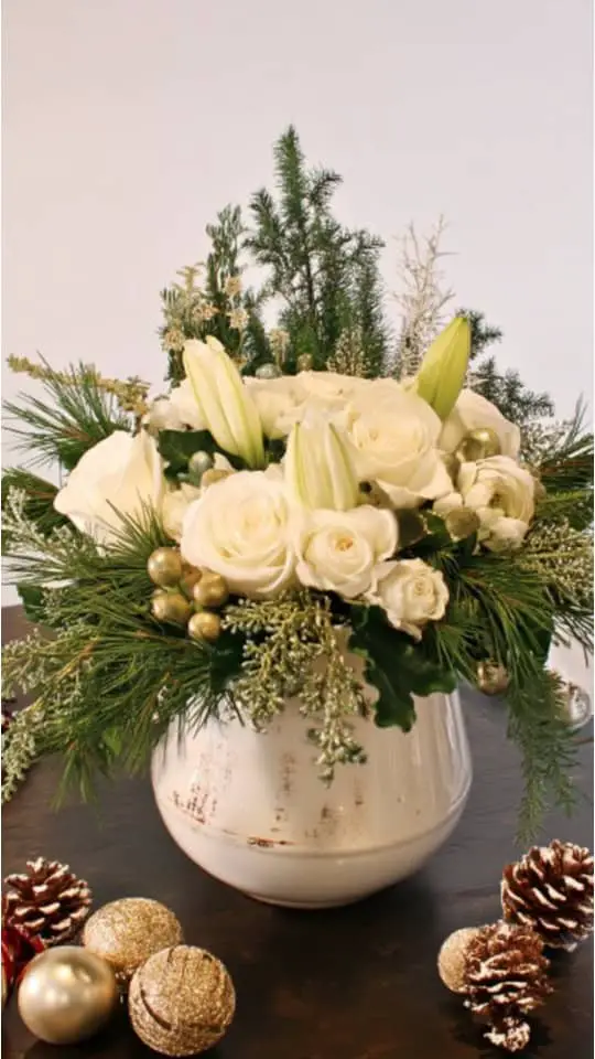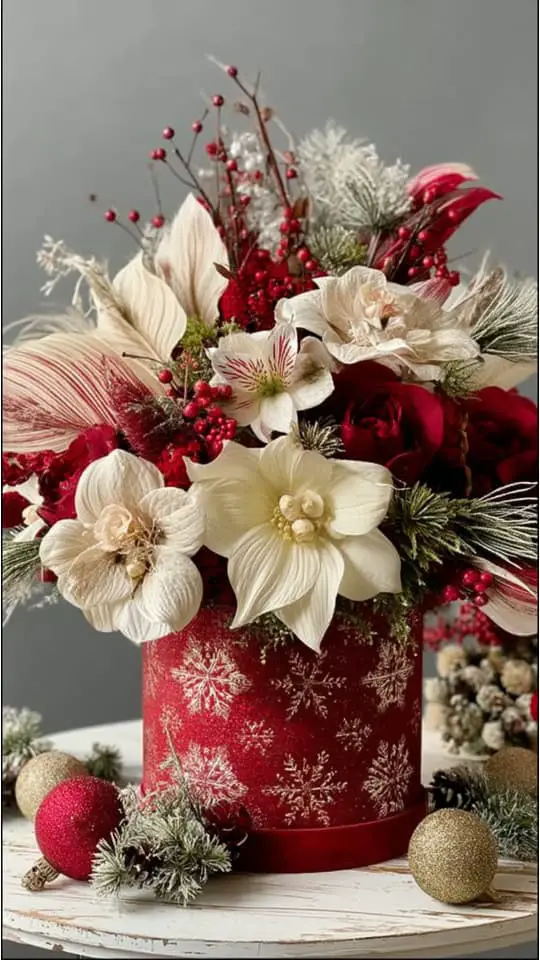 I love how white flowers bring calm beauty to holiday décor. Pure white blooms create serene winter arrangements that feel timeless.