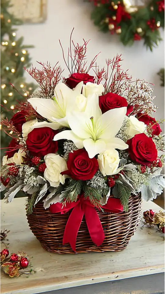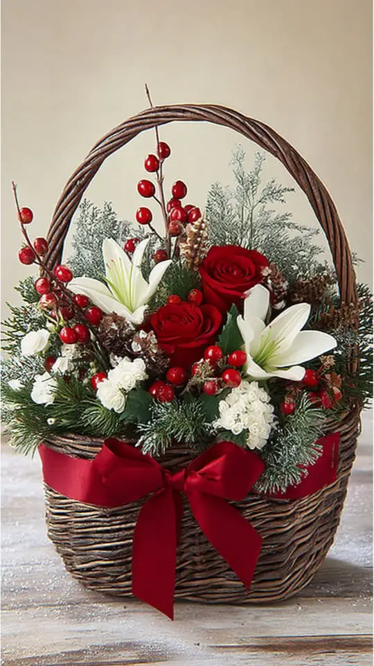 Artificial arrangements are great, but nothing beats the charm of fresh flowers in a rustic basket. I love how Christmas basket floral arrangements can brighten any space with their seasonal warmth.