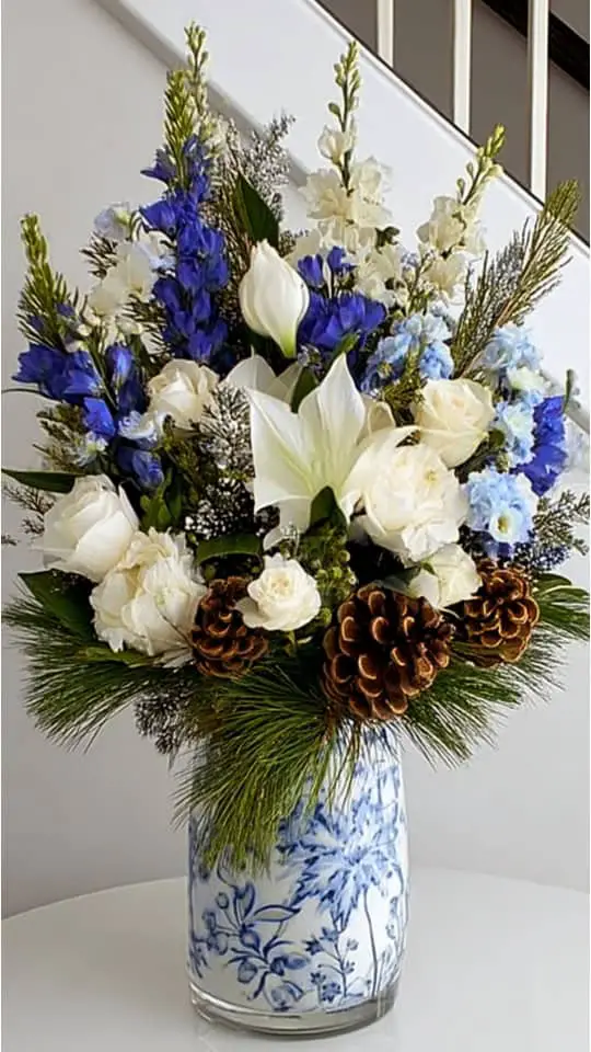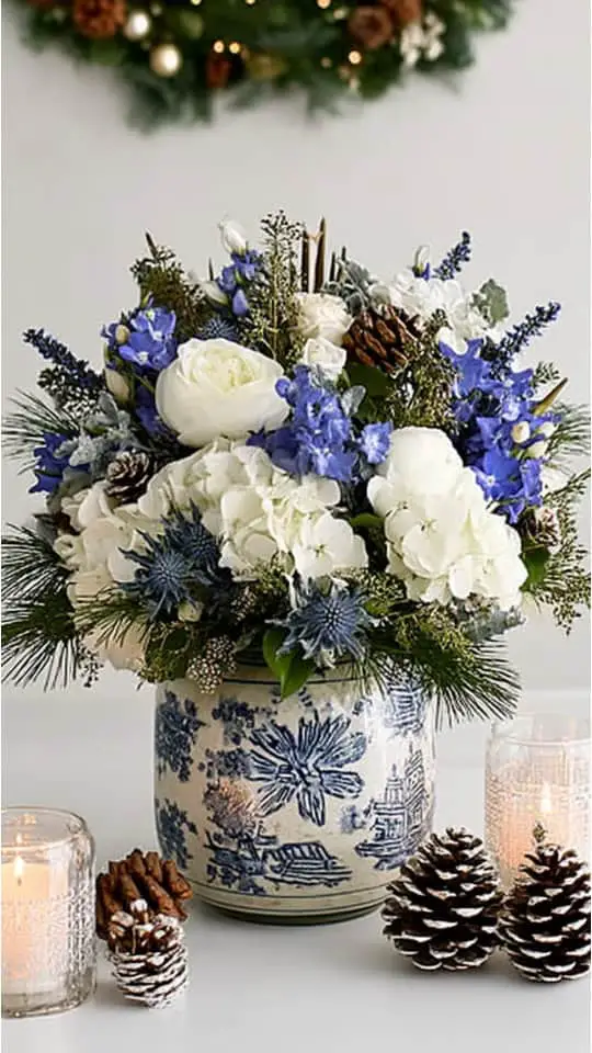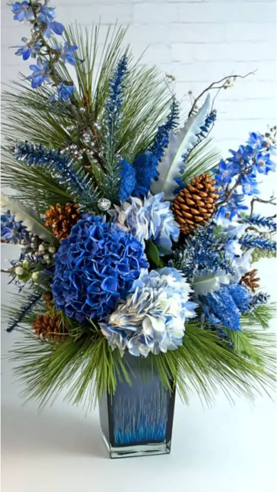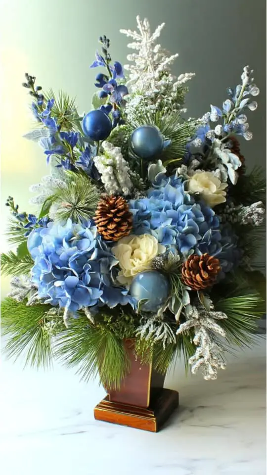 Blue hydrangeas with pinecones make a stunning holiday display. The vibrant blue color stands out against the soft brown of the pinecones, creating a winter feel.