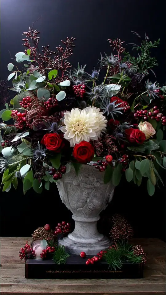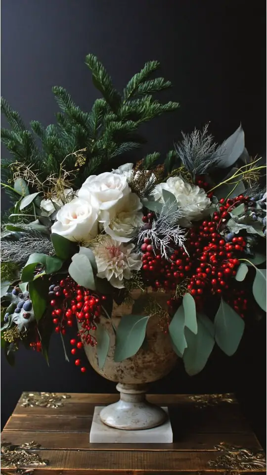 I love the bold look of dark floral arrangements for Christmas. Deep red roses paired with rich, dark foliage create a moody elegance that feels festive and unique.