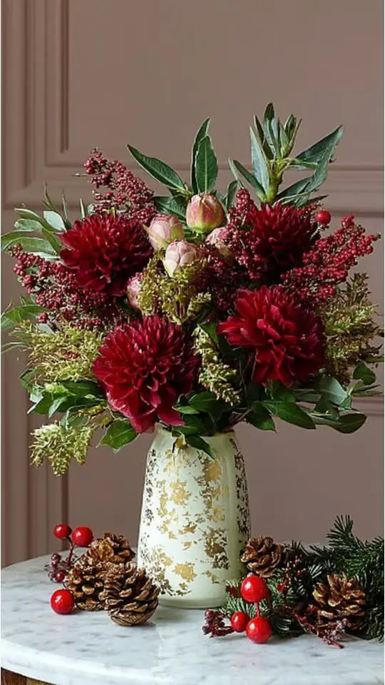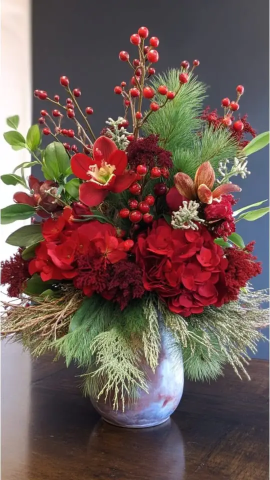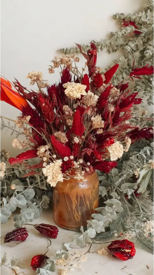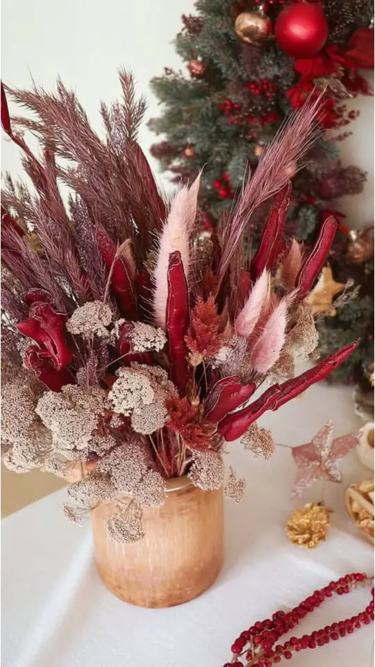 Dried flowers with red tones make Christmas feel warm and cozy. I see these used a lot in rustic holiday décor. Pinecones, cardinals, and dried roses add a natural charm to arrangements.