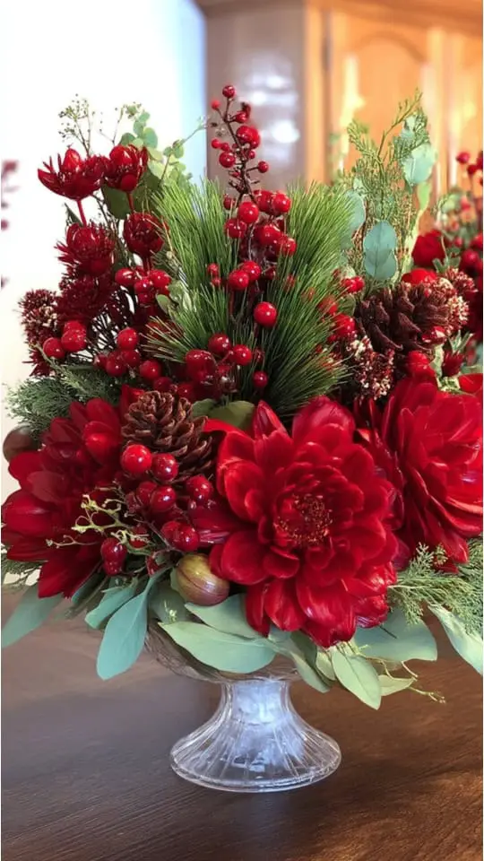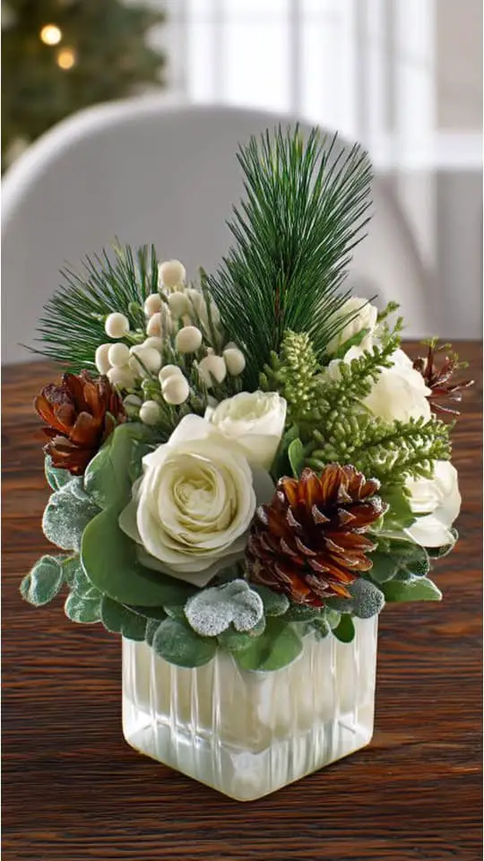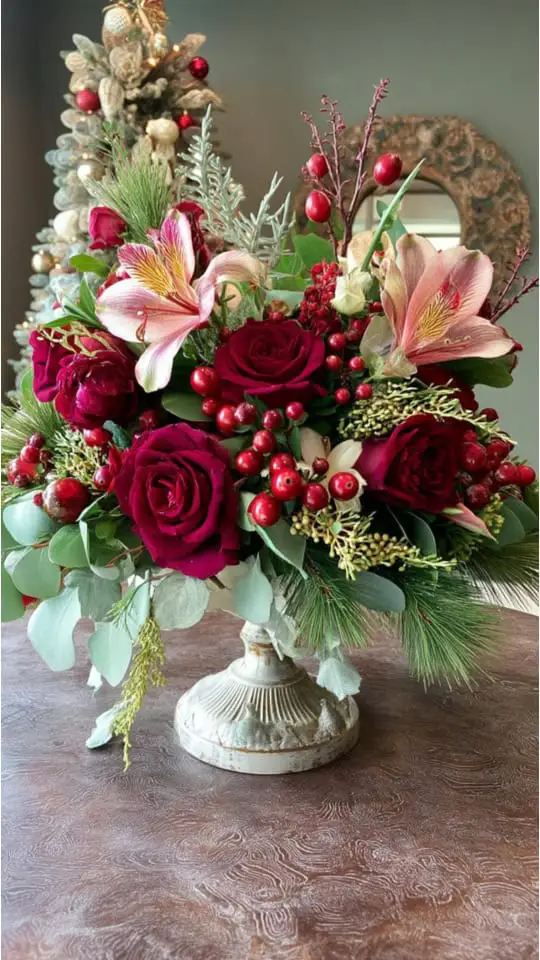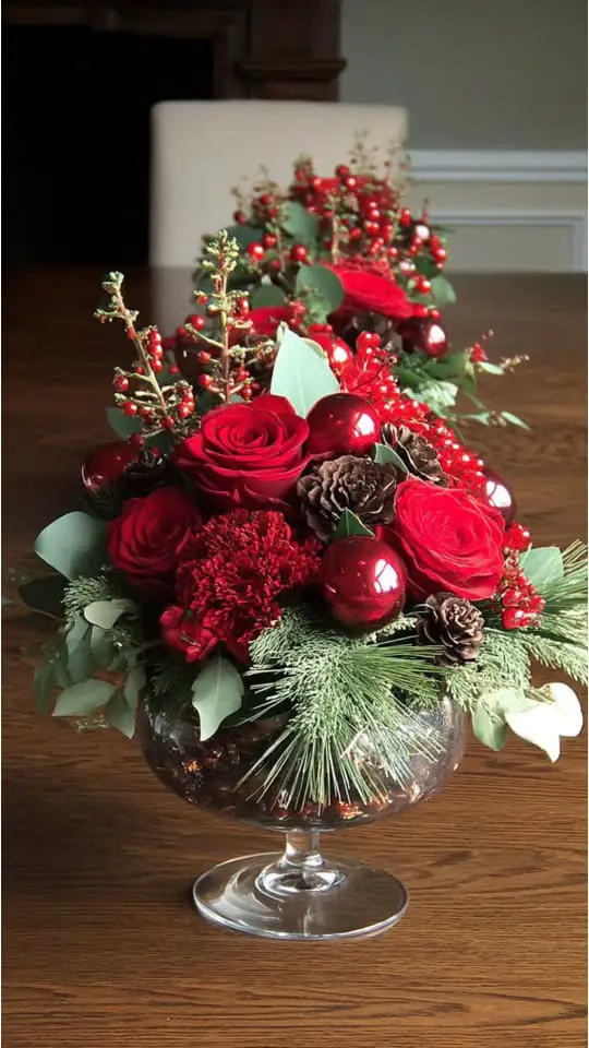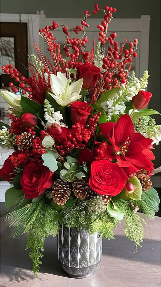 Red roses with pinecones bring both romance and tradition. These arrangements feel timeless and warm, perfect for Christmas décor. I love how the evergreen touches add a fresh holiday vibe.