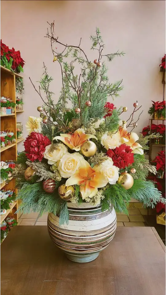 Bright lilies and bold roses add color and life to Christmas Mexican floral arrangements. These designs celebrate culture with unique flair.