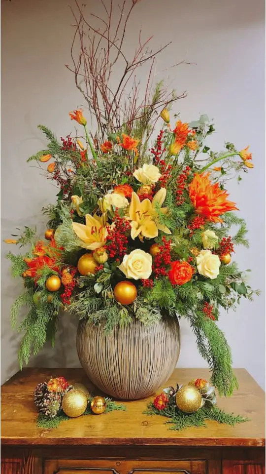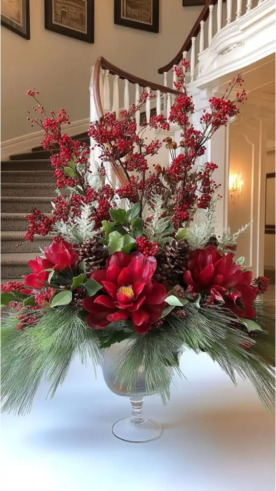 large Christmas floral arrangement makes a bold holiday décor statement. I’ve seen beautiful oversized bouquets with vibrant red blooms like roses, dahlias, or amaryllis.