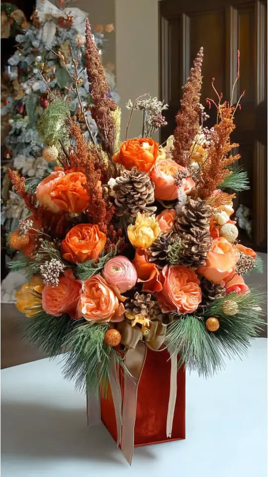 Orange roses brighten any winter space. I mix them with pinecones for texture and warmth. Adding oranges or small fruits makes it feel festive and fresh.