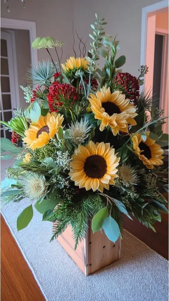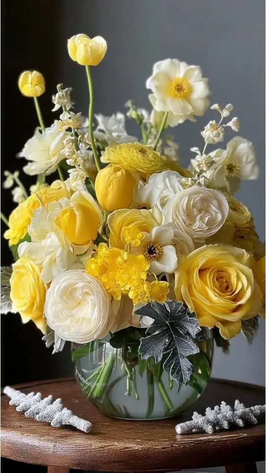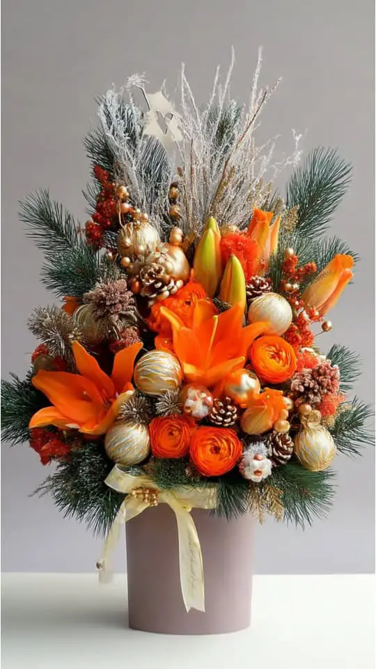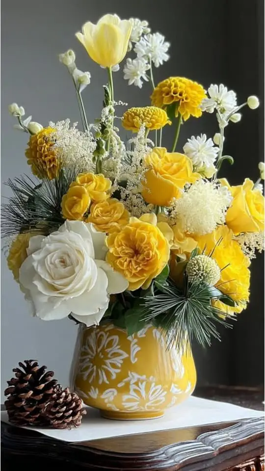 Bright yellow flowers add joy to holiday décor. They bring warmth and a fresh twist to winter arrangements. Mixing them with green needles or red accents creates a cheerful balance.