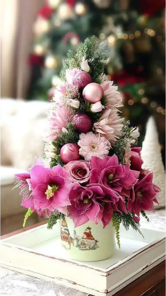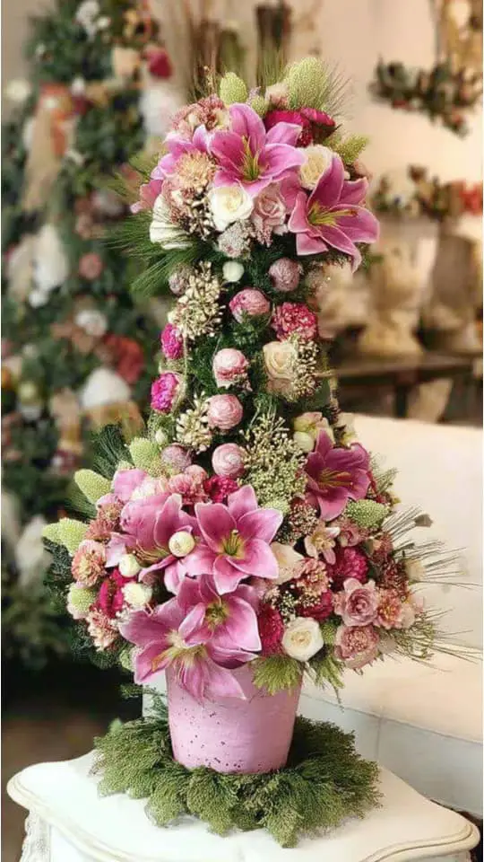 Pink floral arrangements feel fresh after orange roses and pinecones. I love using pink lilies, blush roses, and even pink poinsettias for a tree-shaped design.