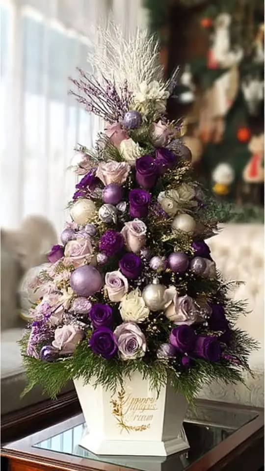 Purple roses with shiny ornaments feel perfect for Christmas décor. They glow with festive charm and bring a magical vibe to any room.