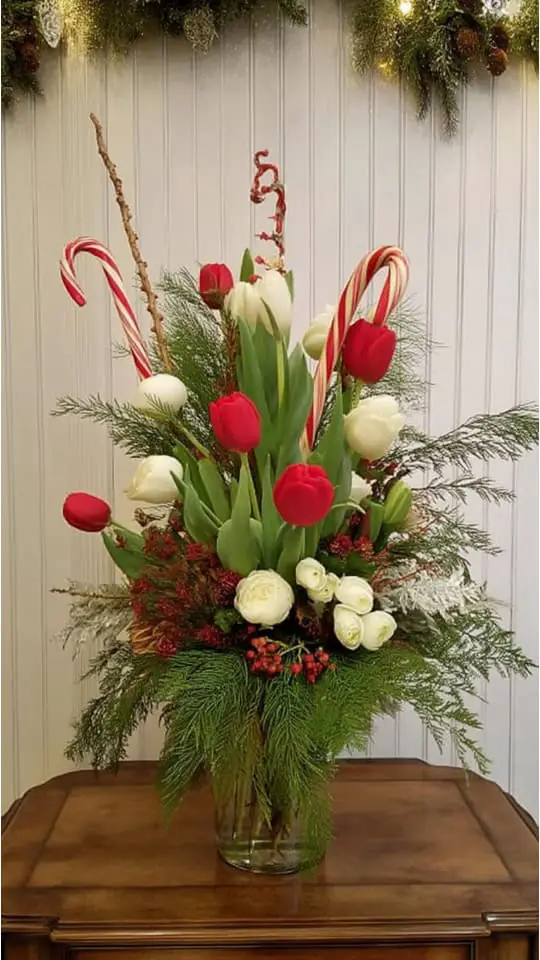 I love combining red and white tulips for Christmas. They remind me of candy canes, so I mix real ones into the arrangement.