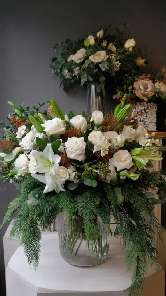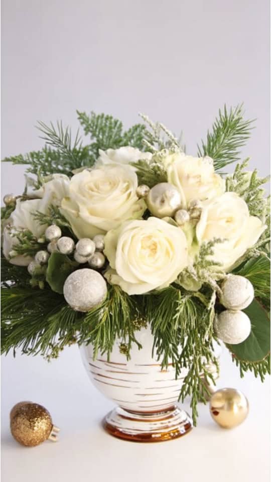 You can try winter arrangements with red roses, white lilies, or poinsettias. Add greenery like pine branches to give it a festive touch.