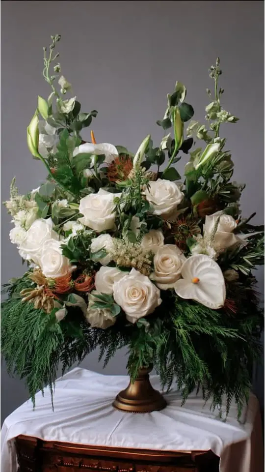 Towering red roses and fresh pine create stunning holiday beauty. I love how these tall Christmas floral arrangements add elegance to any space. The mix of vibrant reds and lush greens feels both classic and festive.