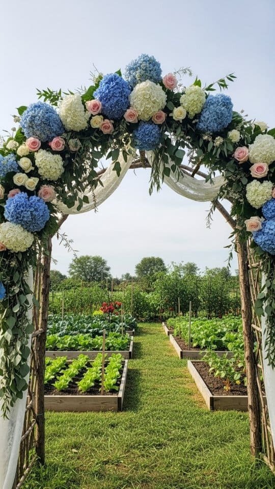 A blooming arch can transform any vegetable garden into something magical. I love how it frames the rows of lettuce, tomatoes, or cabbages while adding a soft romantic touch to the space.