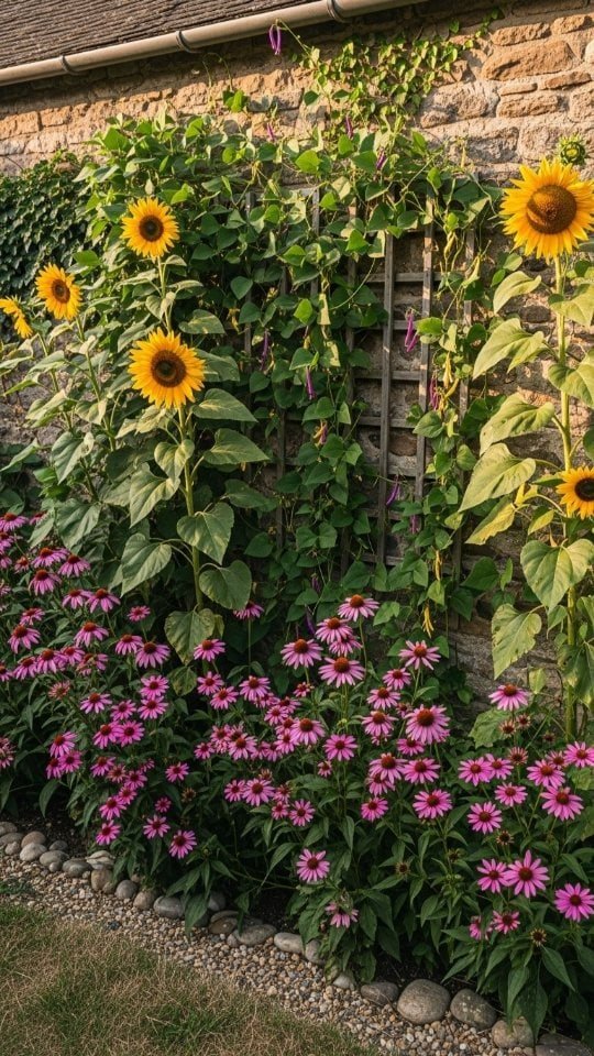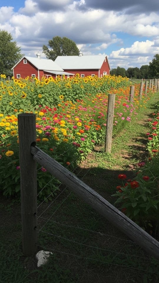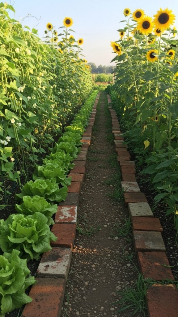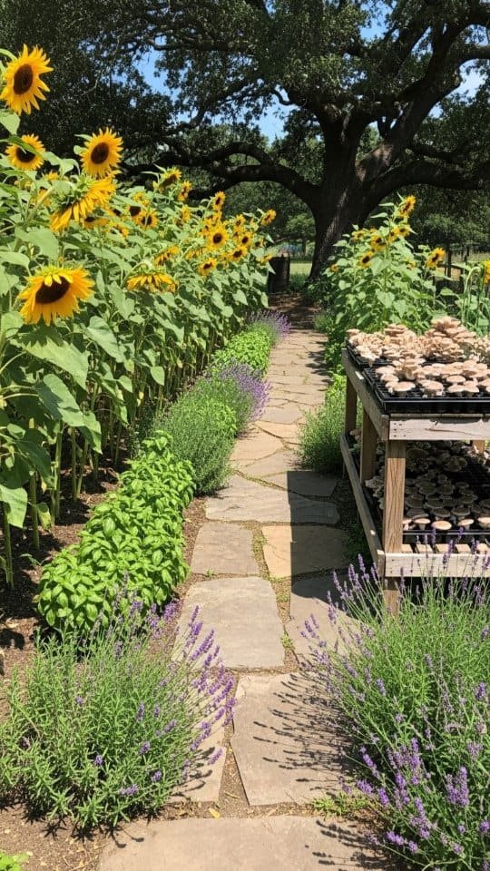 Sunflower rows paired with vibrant beds attract pollinators while boosting companion planting efforts perfectly into place.