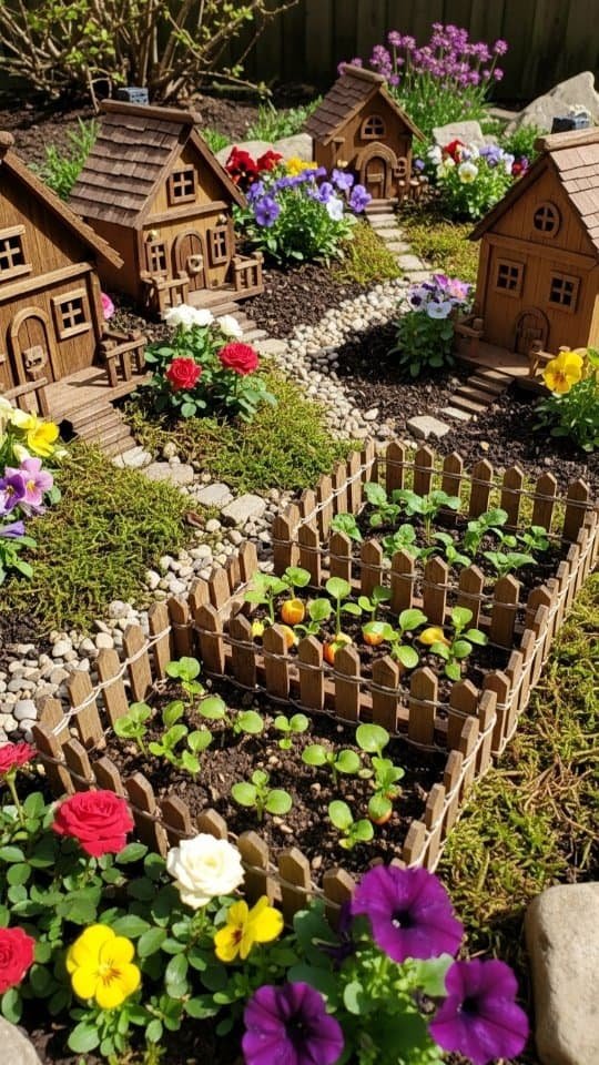 Raised beds full of lavender and hydrangeas bring charm, but adding tiny cottages creates magic. Bright flowers surround these mini homes, making the garden look like a storybook scene.
