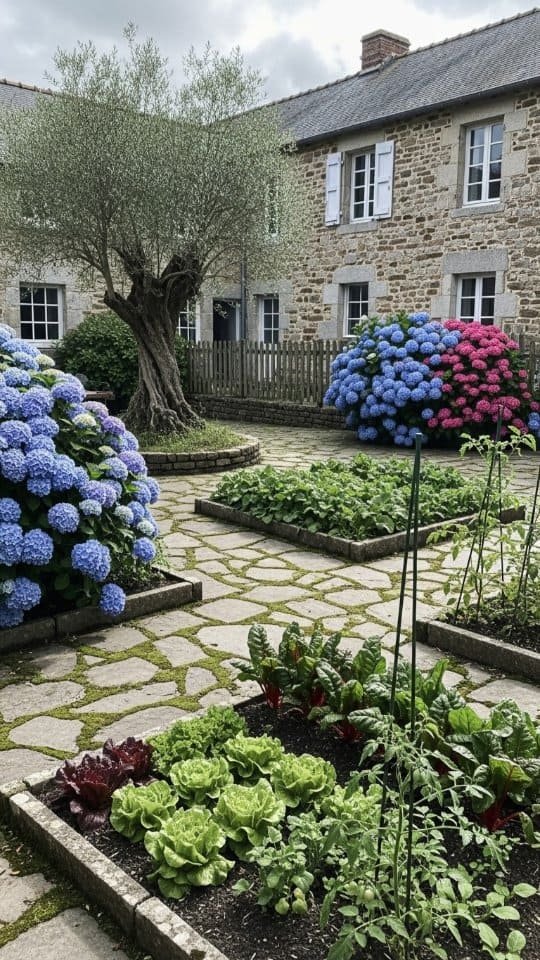 Nearby, a blue building trimmed in white adds color. This mix of style and function makes every visit special in my kitchen garden.