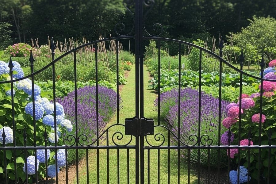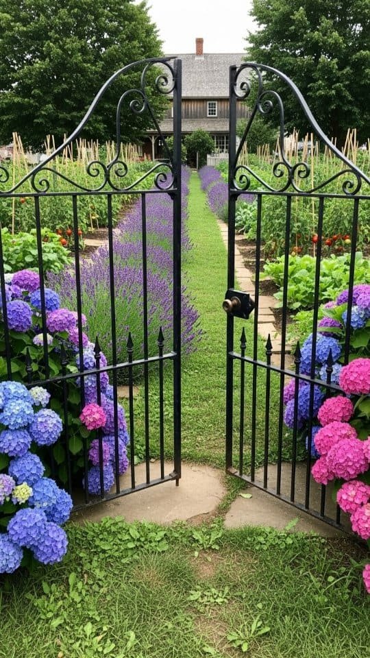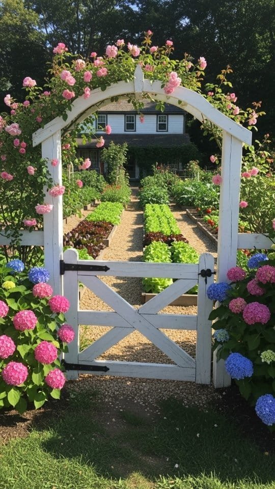 A white picket gate makes any garden feel inviting. It opens to a space filled with blooming hydrangeas and neat vegetable rows. I love how it creates a clear border while adding charm.