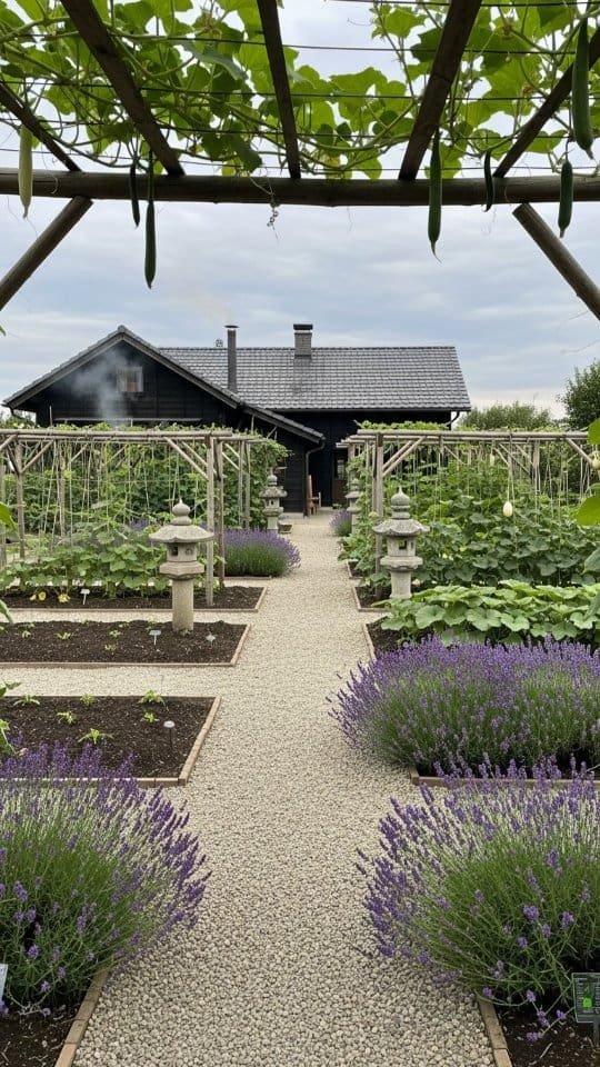 Gravel paths wind through neat rows of vegetables. Stone lanterns add charm and calmness. Lavender grows beside the beds, softening the edges with its scent.