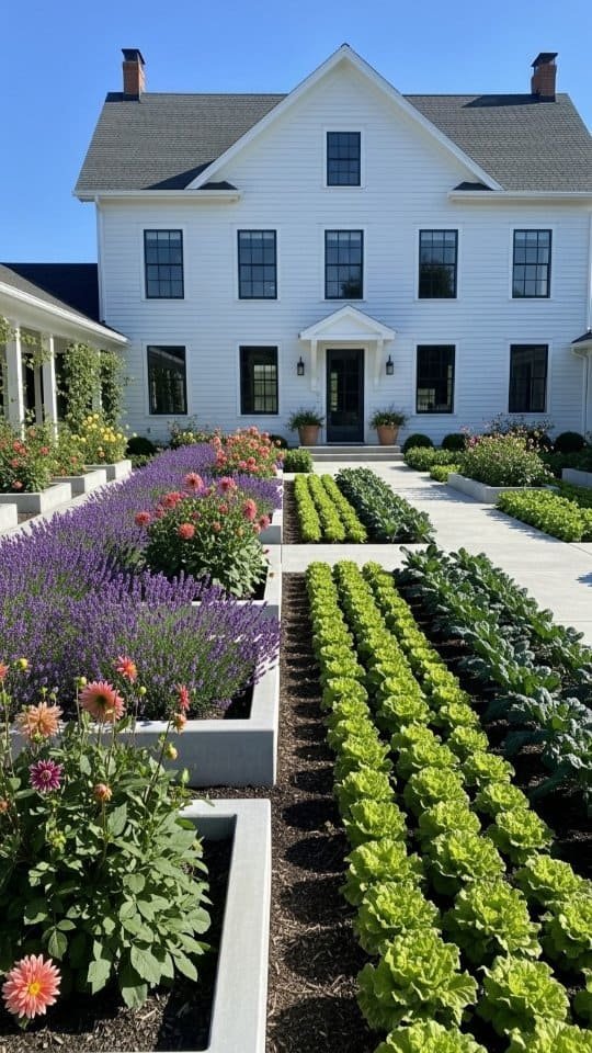 A white farmhouse acts as a pretty backdrop for this tidy layout. Symmetry gives that clean, modern look while keeping things simple.