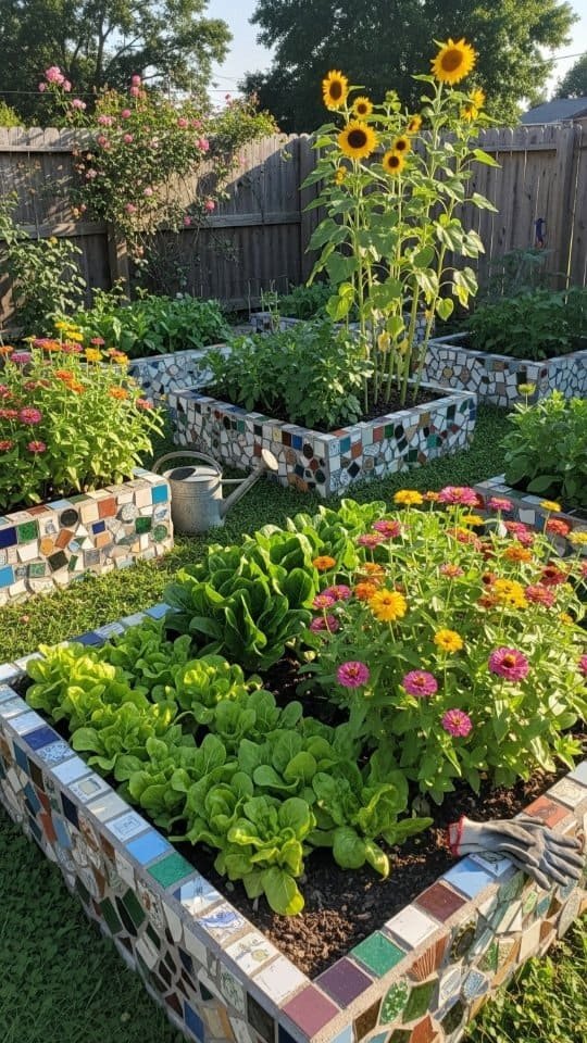 Bright tiles make the flower beds pop with color. Sunflowers, lettuce, and fresh flowers grow happily in these raised beds surrounded by a picket fence made of pallet boards.