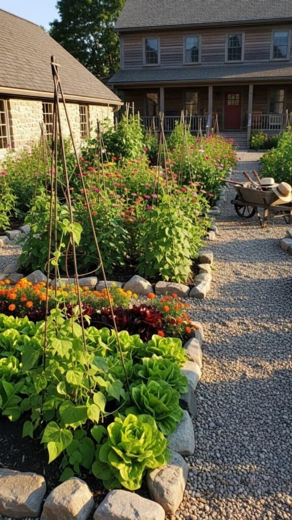 Lettuce grows thick, marigolds add bright color, and climbing beans stretch up trellises or stones.