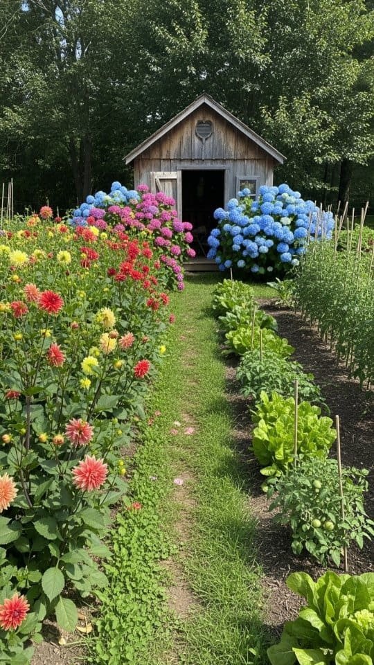 Bright dahlias and soft hydrangeas create a colorful frame around the wooden shed. I like using lavender and other perennials nearby to add more charm.