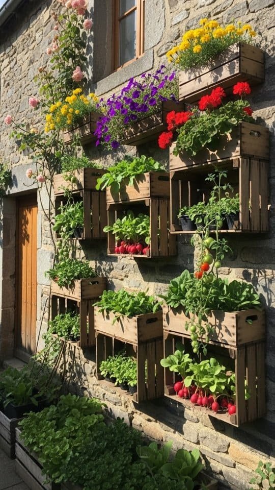 Chickens wandering freely in vintage gardens are charming, but wall farm gardens show the magic of vertical gardening. Wooden crates attached to stone walls make small spaces bloom with life.