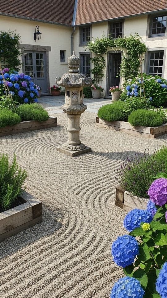 Raked gravel swirls around a stone lantern, creating calming waves. This design feels like flowing water and brings peace to the space.