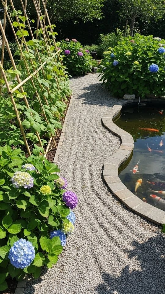 I love how hydrangeas bloom nearby, adding soft blues and purples. Lavender grows beside them, filling the air with a soothing scent.