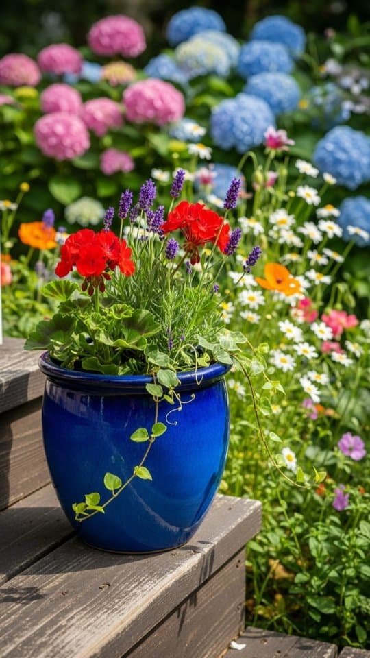 A bright blue flower pot can make any garden pop. It contrasts beautifully with colorful blooms, like red geraniums or yellow sunflowers. I love using these pots to boost curb appeal.