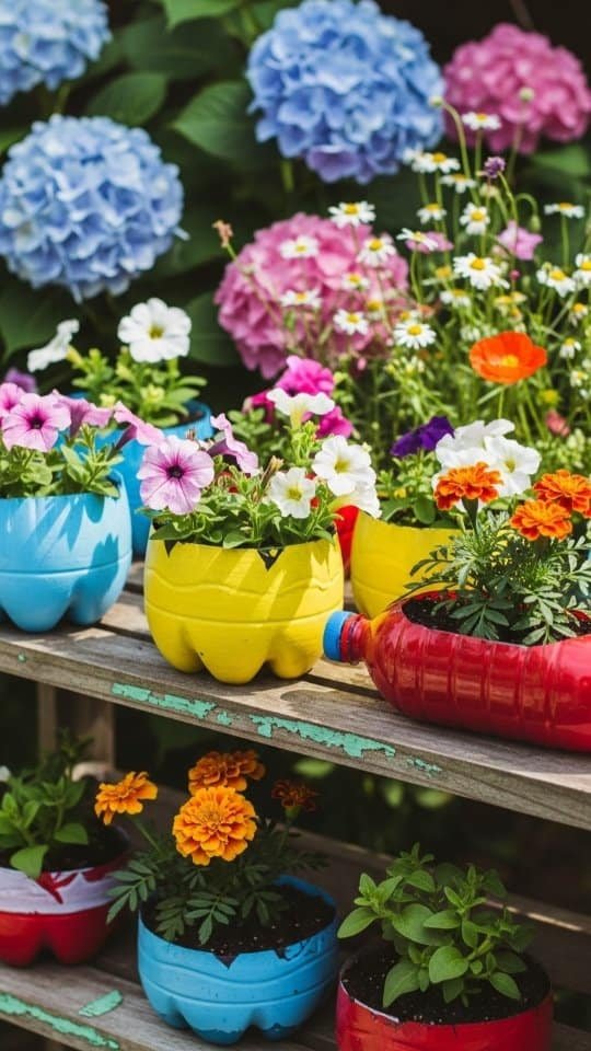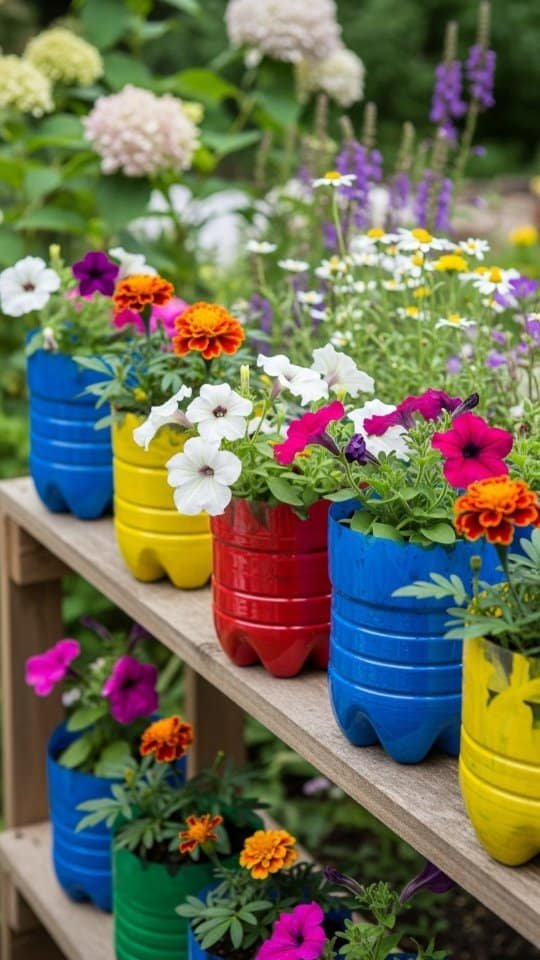 Blue pots are stunning in gardens, but painted bottles bring fun and eco-friendly charm. I love turning old plastic bottles into flower planters. They’re cheap, cute, and good for the planet.
