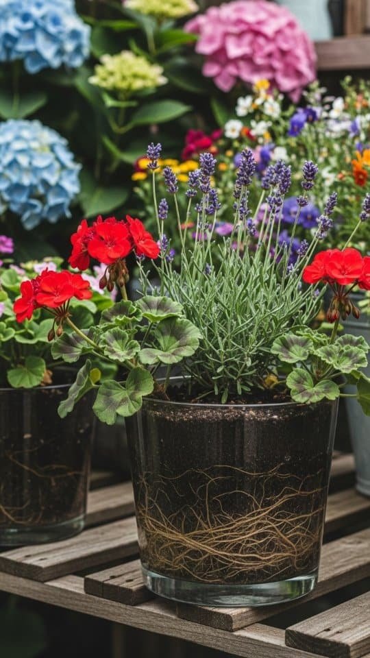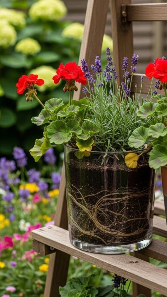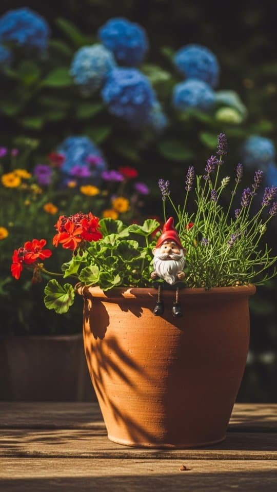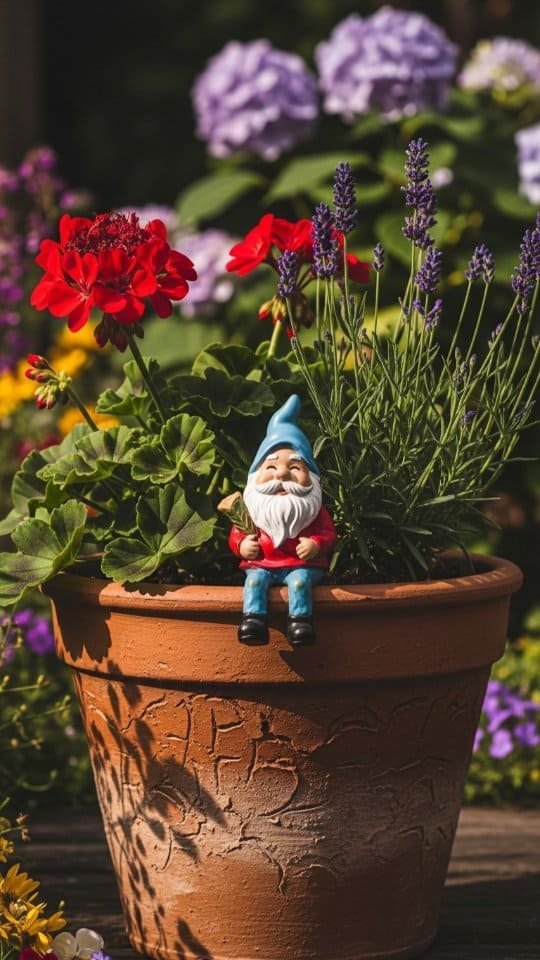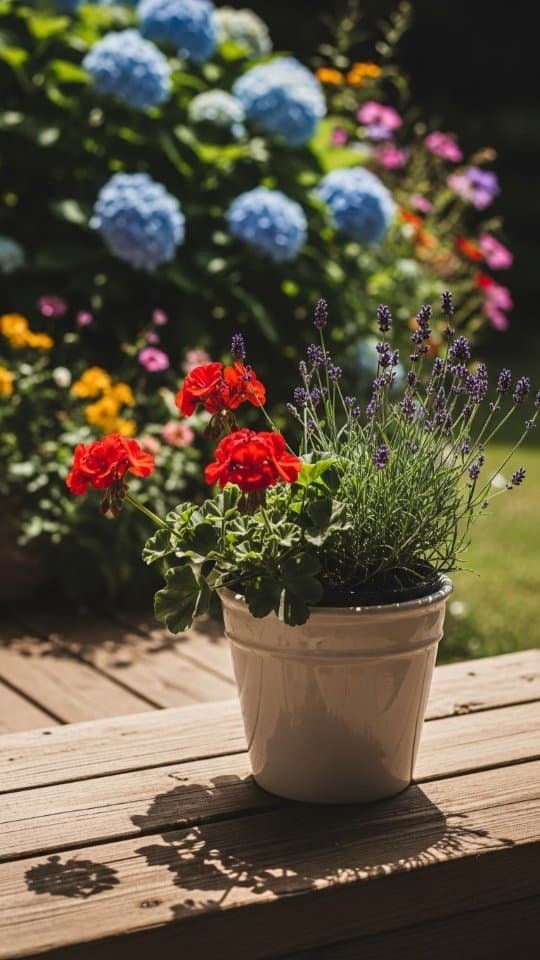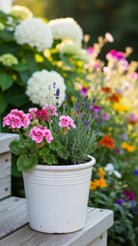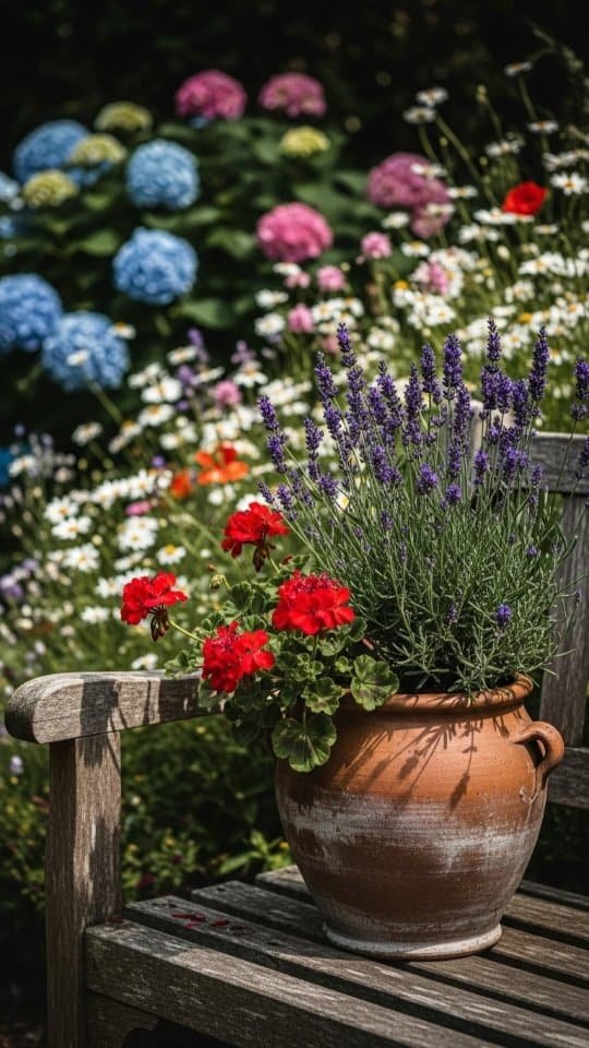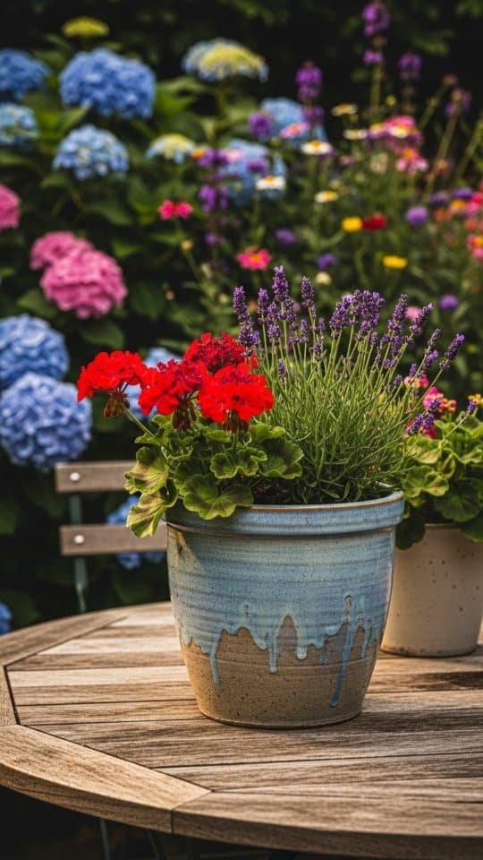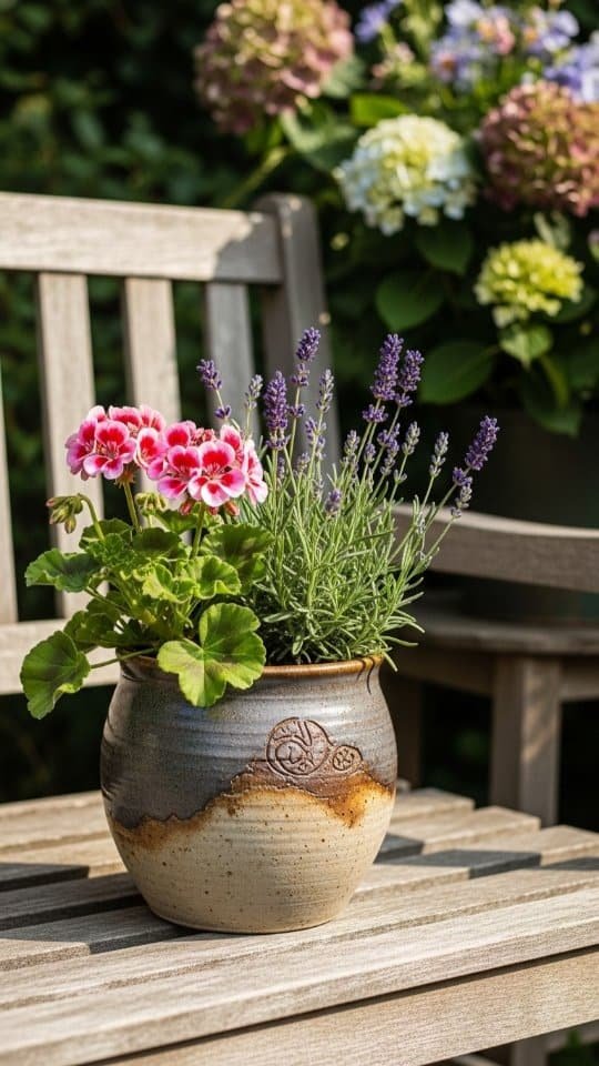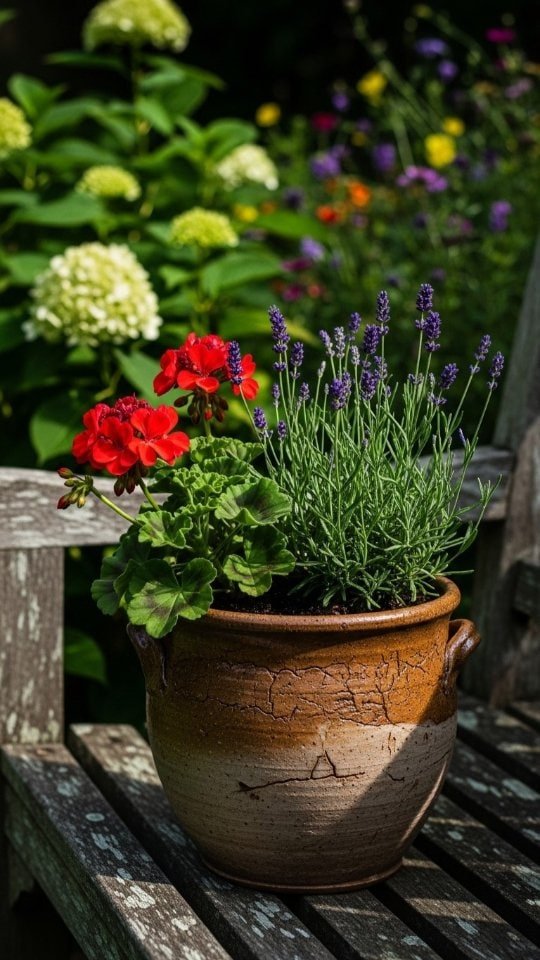 A rustic clay planter feels like home in any garden. I love using mine to show off lavender and red geraniums. These two plants look great together. The soft purple of the lavender mixes beautifully with the bold red blooms.