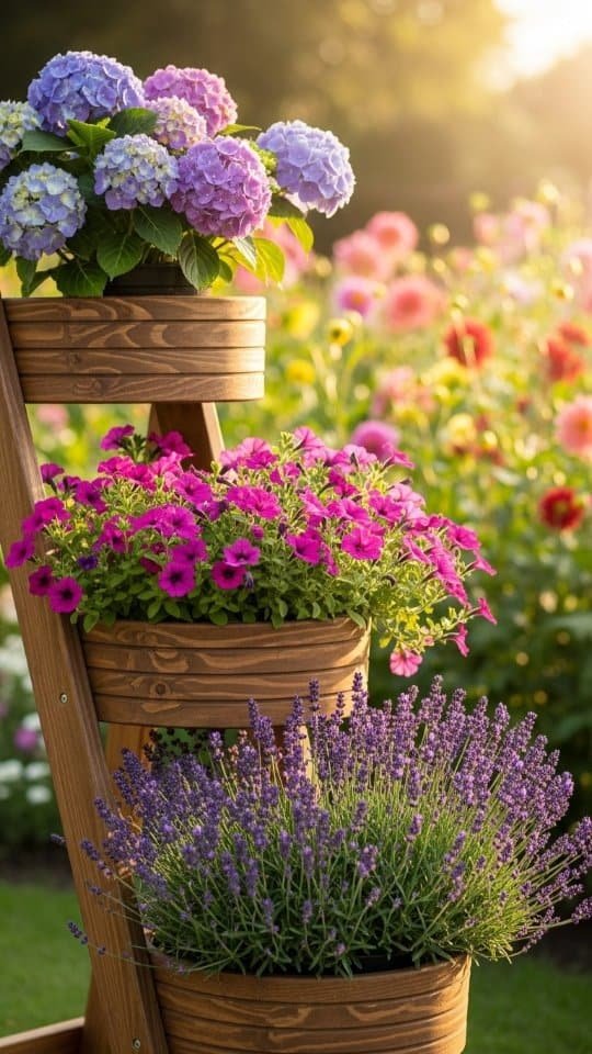 Cascading flowers like petunias or ivy drape beautifully from each pot, creating a waterfall effect.