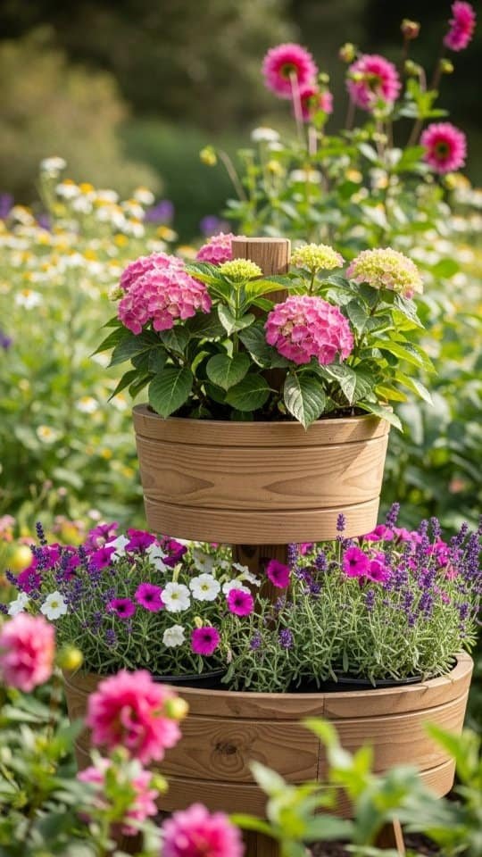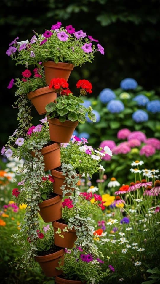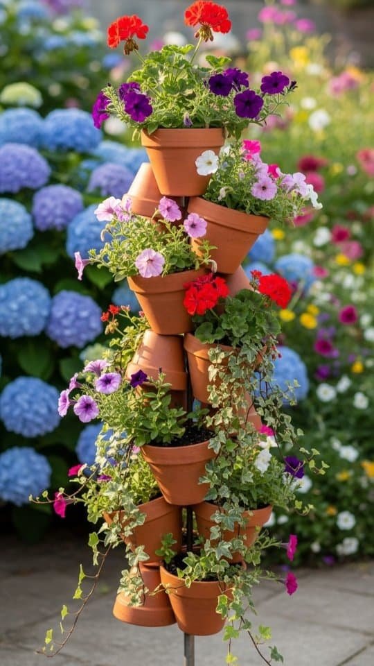 I love how stacked pots can make a space come alive. A flower pot tower is perfect for patios or balconies where space is tight. Using three to five pots, I stack them with soil and flowers spilling over the edges.