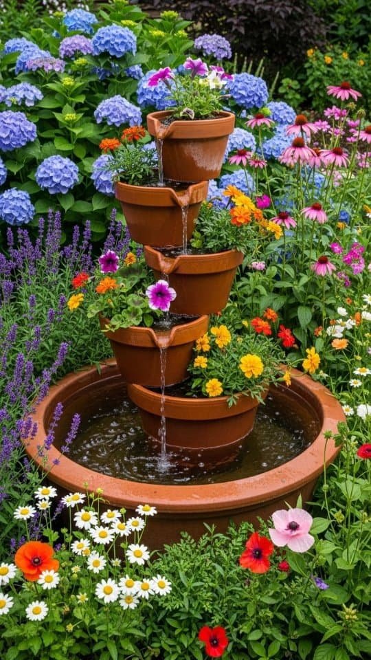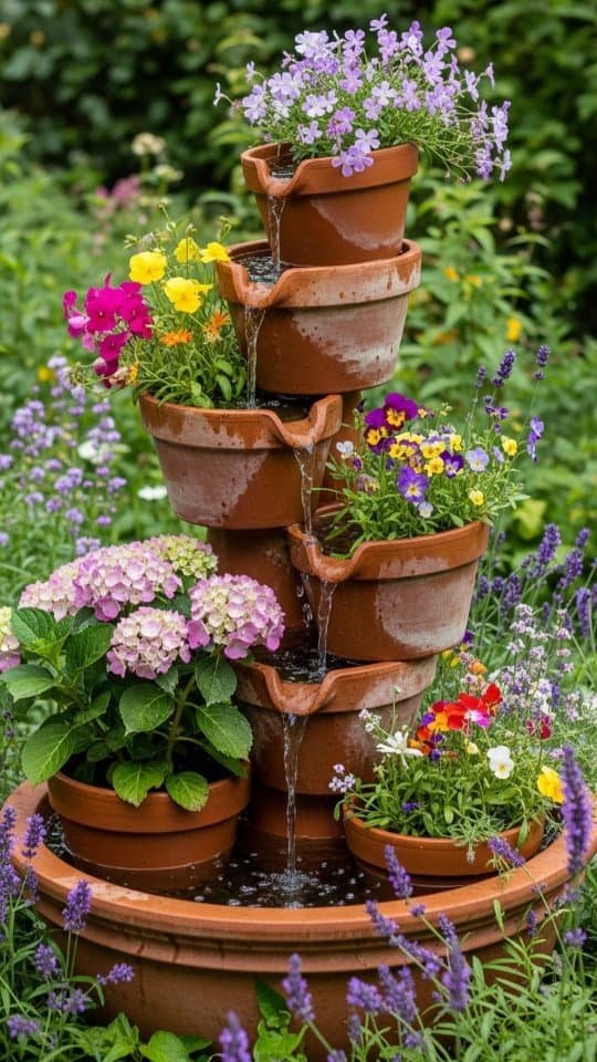 A tiered fountain using flower pots looks beautiful and is easy to make. I use two plastic planters, one 22 inches wide and the other 18 inches, along with a ceramic pot.