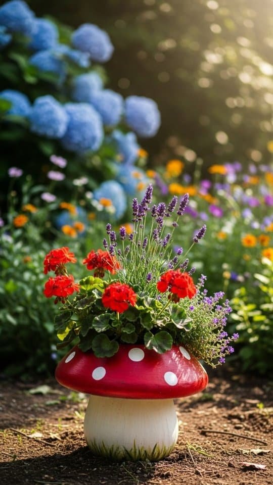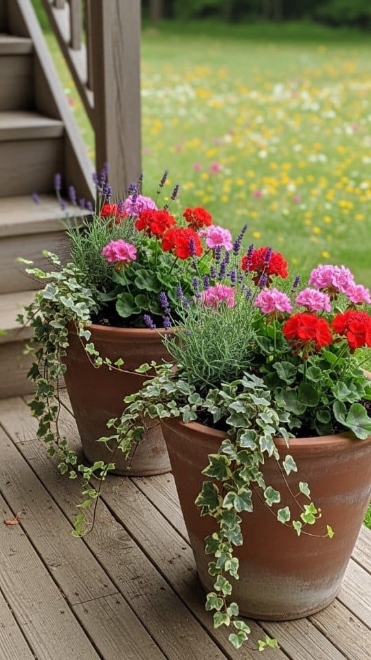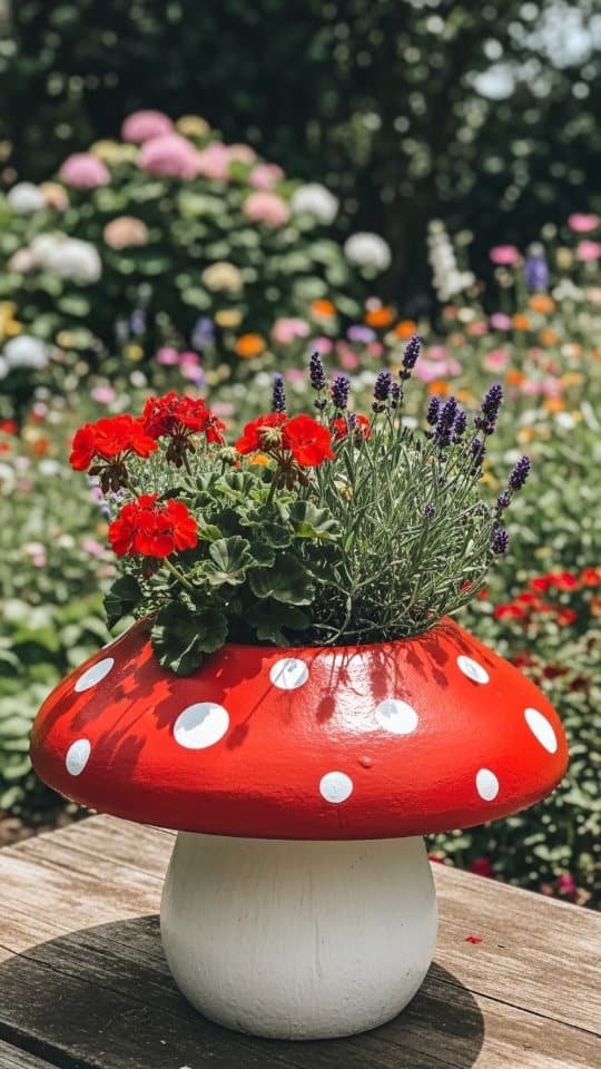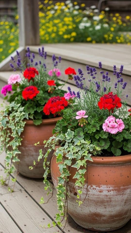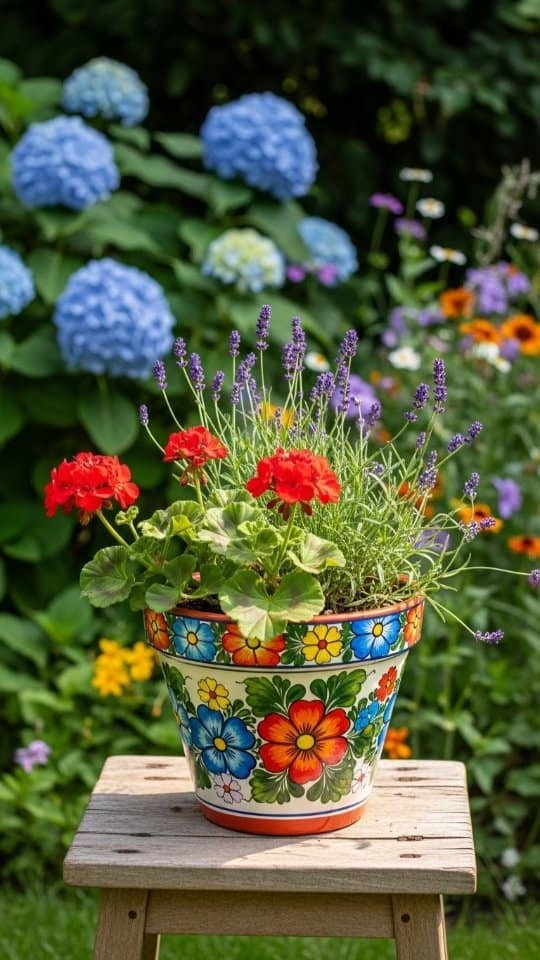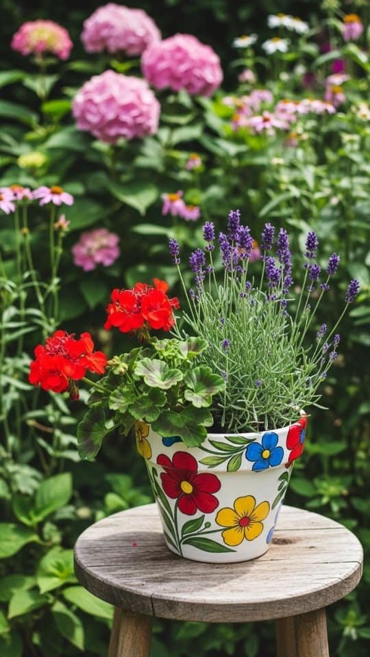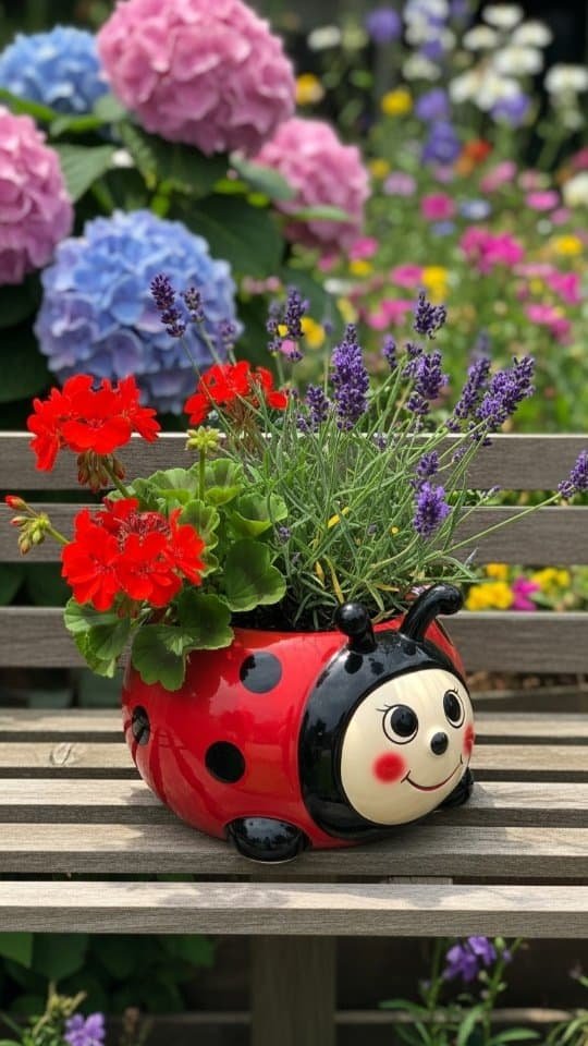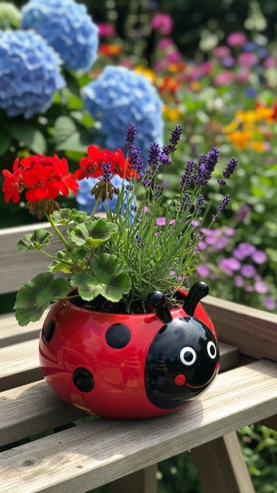 I painted a terracotta pot with bright ladybug flowers. It looked so cute! Then, I filled it with lavender and red geraniums. The mix of colors made it playful and cheerful.