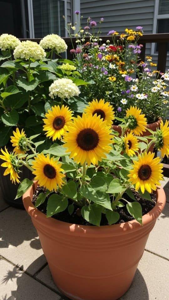 I like adding zinnias or marigolds to the pot too. They mix well with sunflowers and need the same care. Regular watering helps them stay happy all day under the sun.