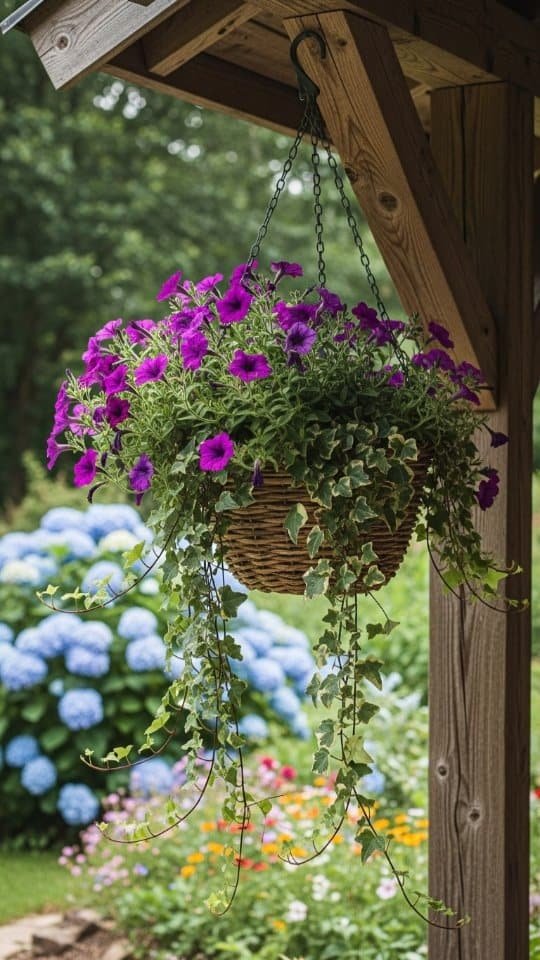 I love hanging flower baskets filled with cascading vines and purple blooms. Million Bells and Petunias work great for this look. Their vibrant colors stand out, making any space cheerful.
