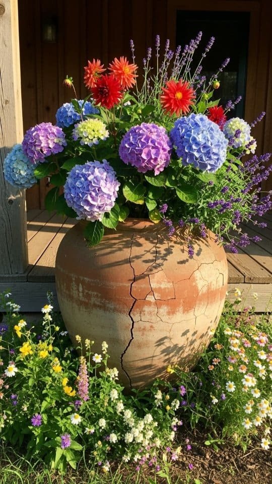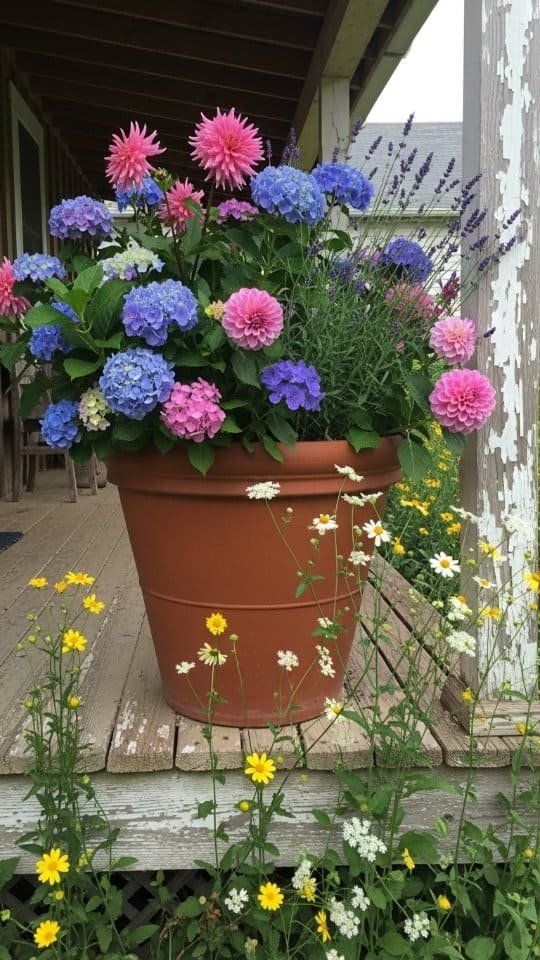 Oversized terracotta pots make flowers shine. I love using one for hydrangeas and dahlias. Their bold colors pop against the earthy pot.