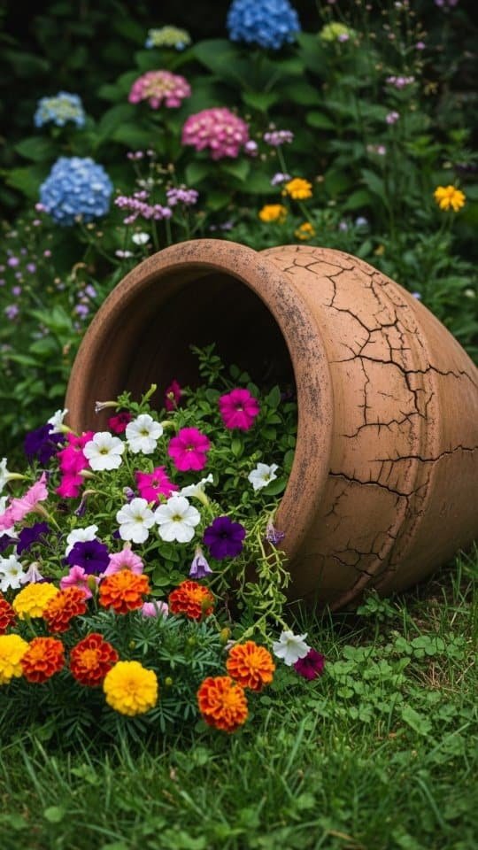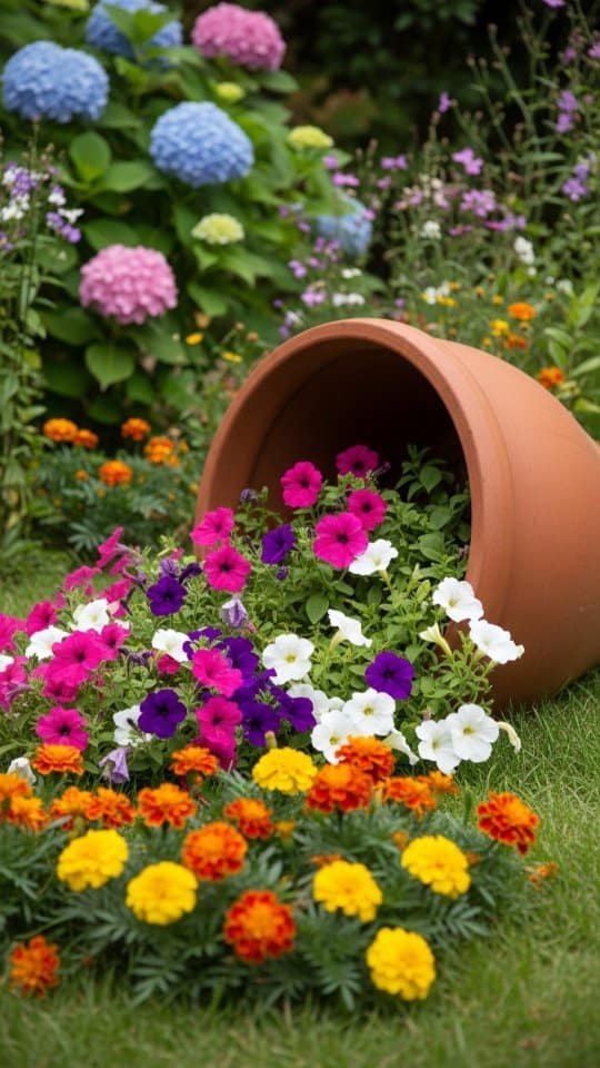 A tipped flower pot can create the look of flowers spilling onto your lawn. I love how it adds movement and color to a garden space.