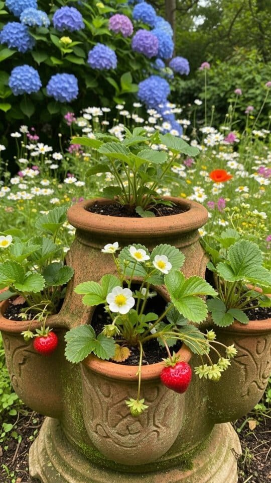 Strawberries love full sun and well-draining soil. Using good potting soil helps them thrive. Their small white flowers turn into sweet red berries, adding beauty and flavor to your garden space!