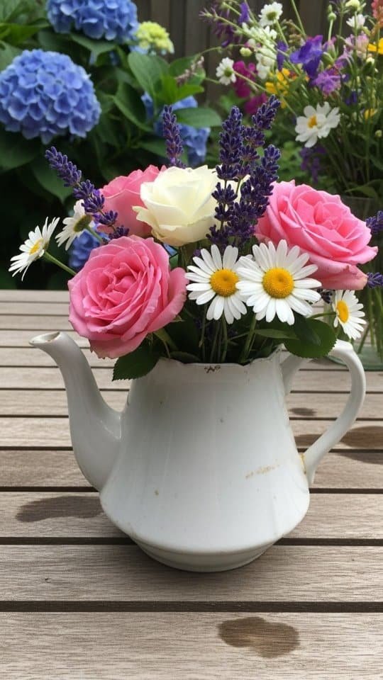 A vintage teapot makes a sweet flower pot. I filled mine with roses, daisies, and lavender. The mix of colors looks soft and pretty.