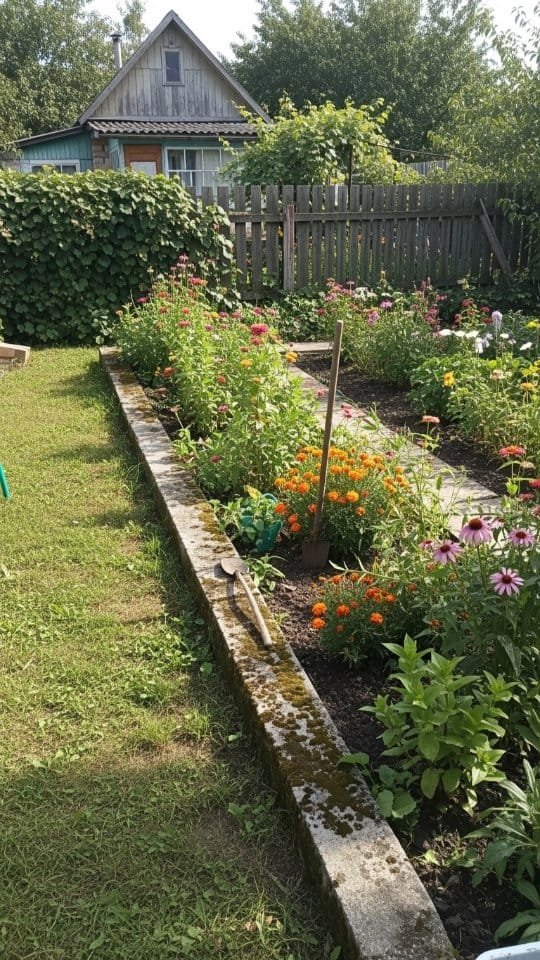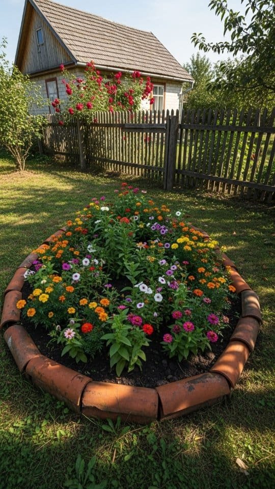 I used old roof tiles to edge my garden beds. They gave the borders a neat, curved look and added charm. These tiles hold moisture, which helps plants grow better.