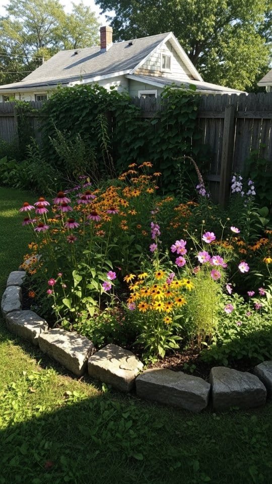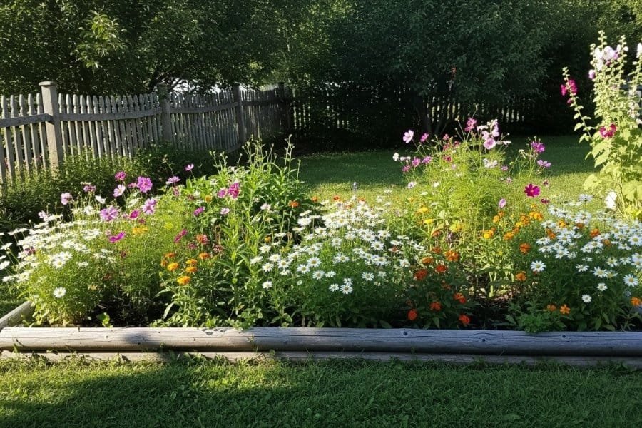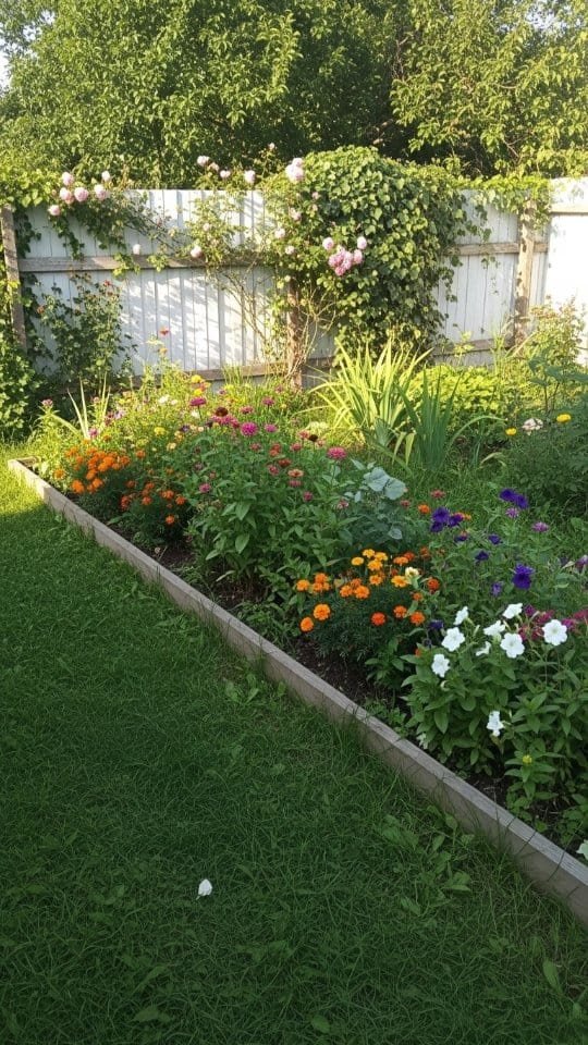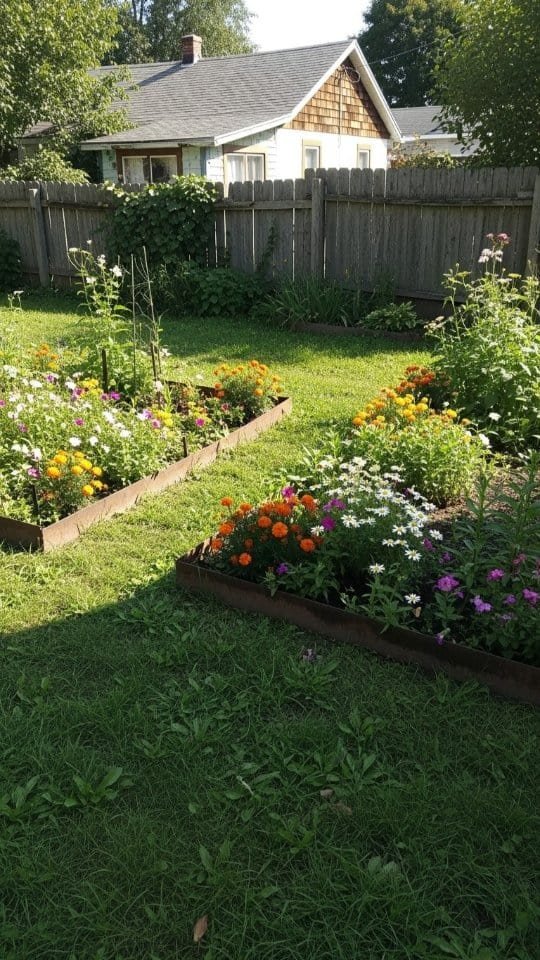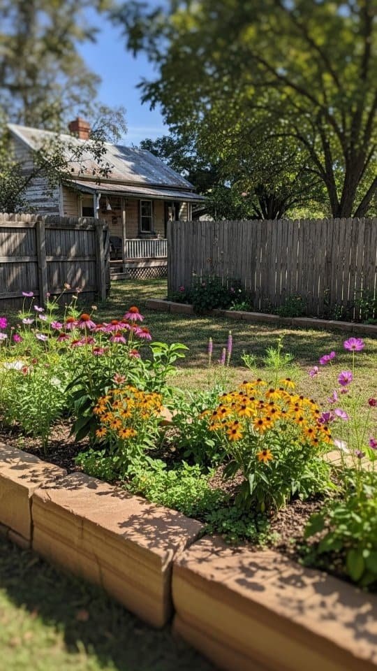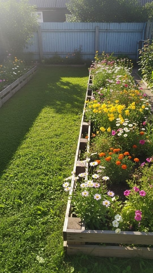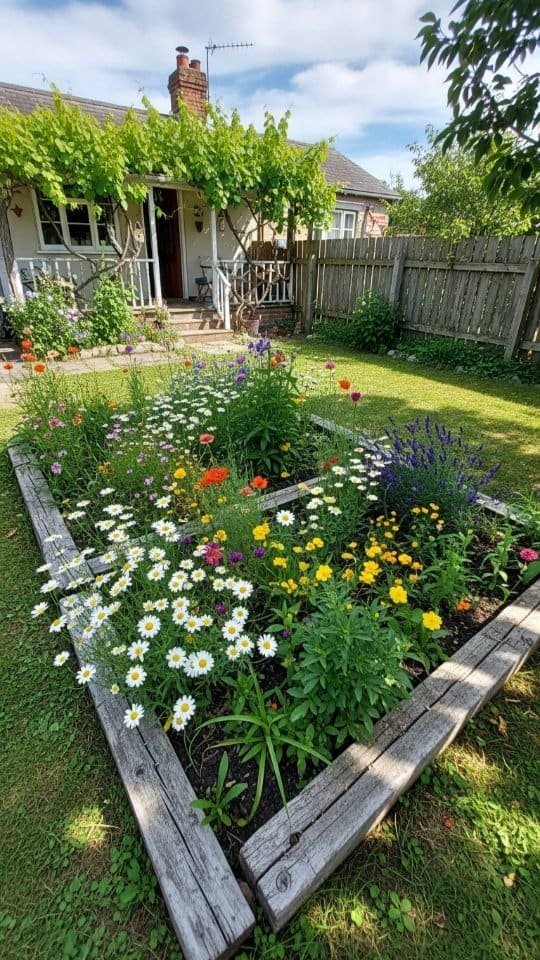 The raised bed highlights upcycling while keeping flowers neatly contained. It’s creative and sustainable landscaping!