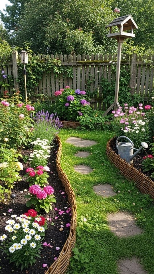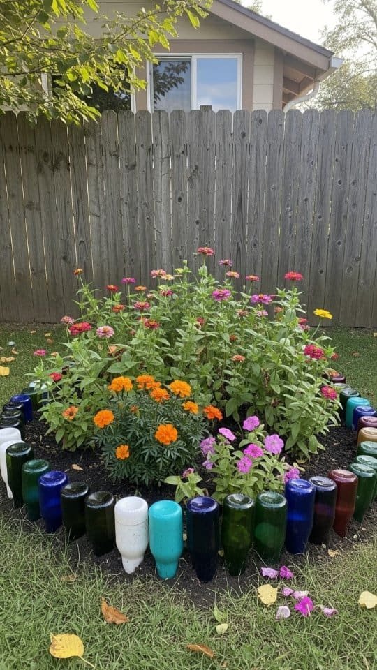 Willow edging adds charm, but wine bottles bring unique flair. I use colorful recycled wine bottles for borders. Green and cobalt blue are my favorites.