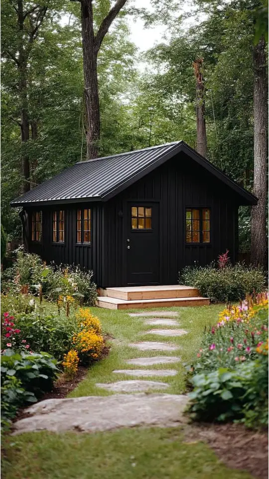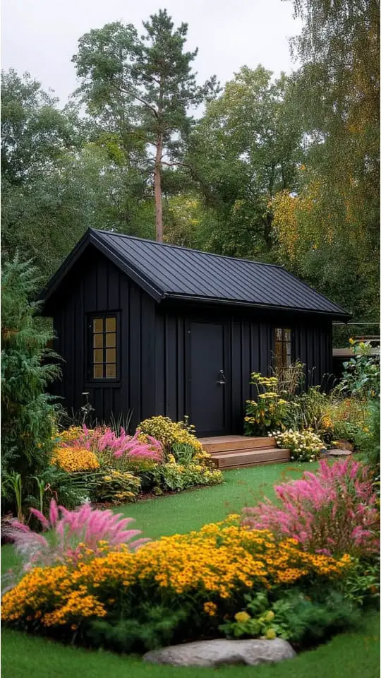 A garden shed can transform a space. Black sheds offer sleek, modern charm. Brick ones look rustic and cozy against green plants.