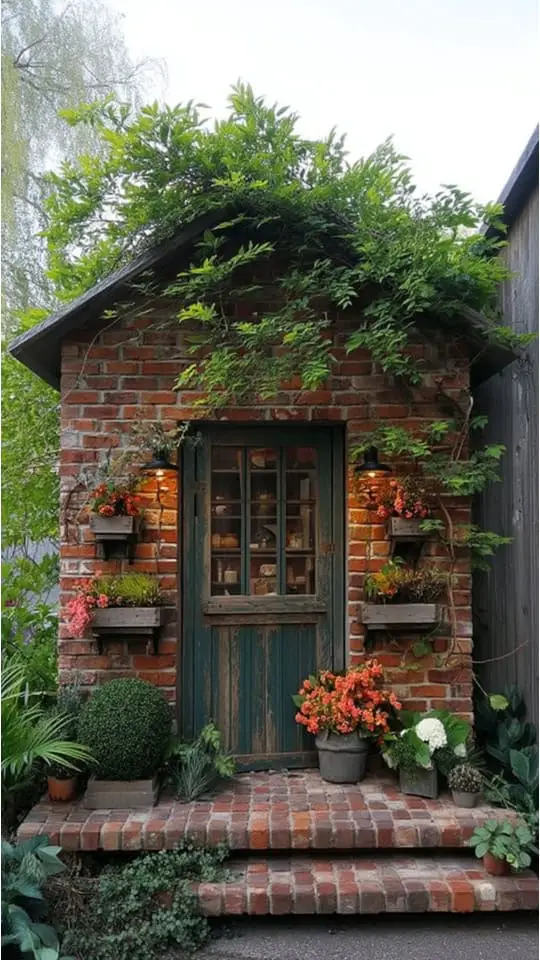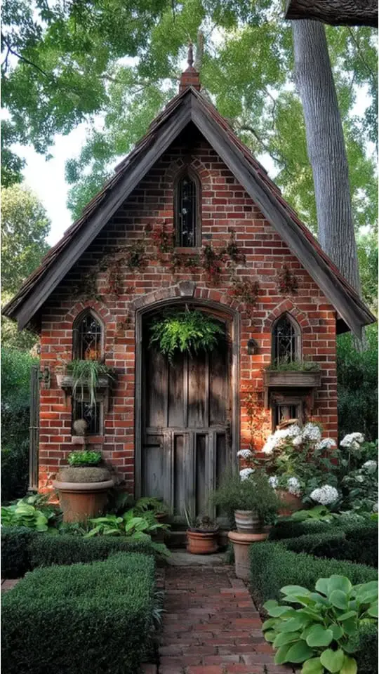 I love the charm of a brick garden shed. The rustic bricks look stunning against lush green plants, creating a natural and cozy vibe.