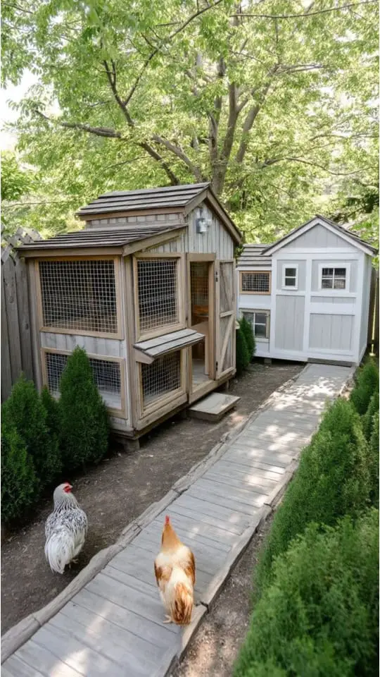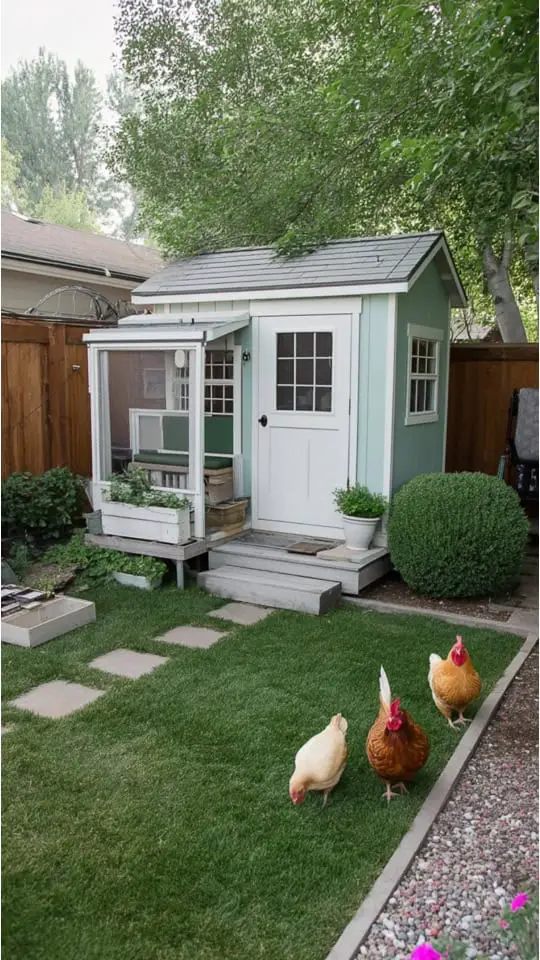Inside, I added roosting bars, nesting boxes, and a droppings board for easy cleaning. Windows provide fresh air, while latches secure the space.