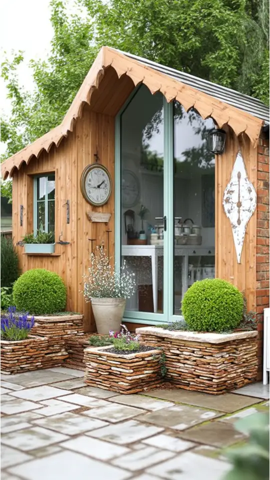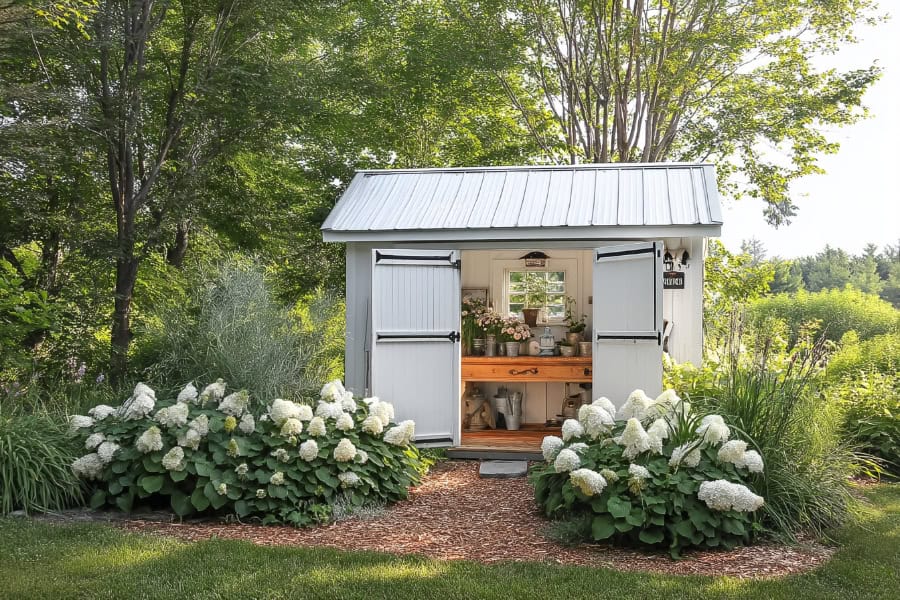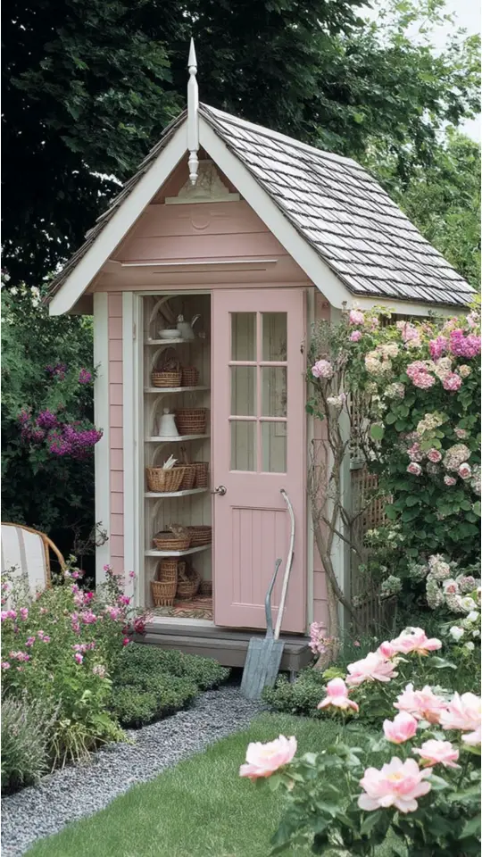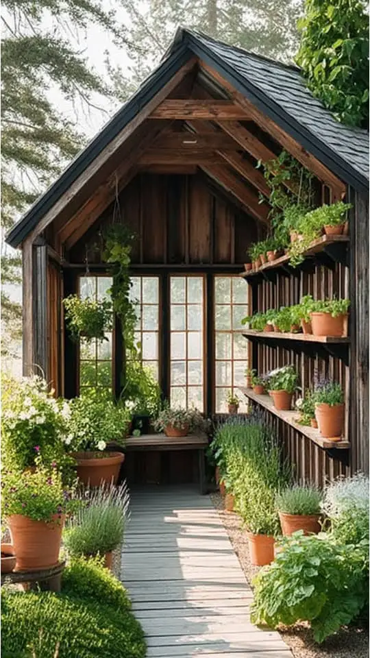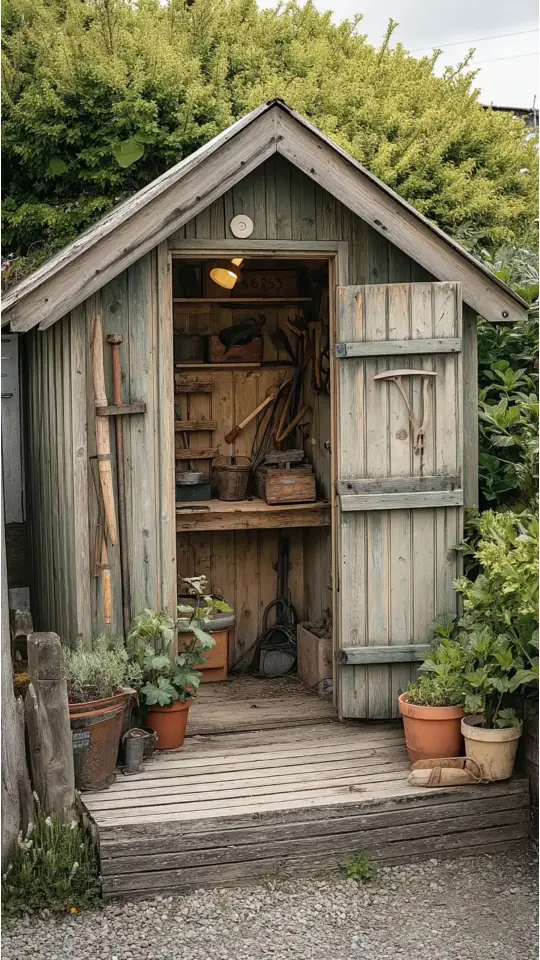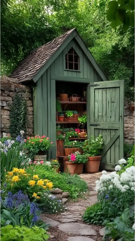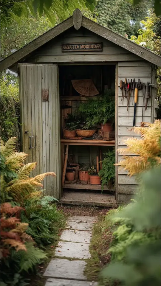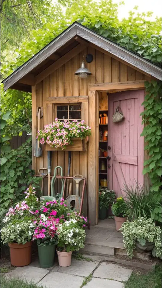 A potting shed with plants feels like a gardener’s special corner. It holds gardening tools, flower pots, and small display items.