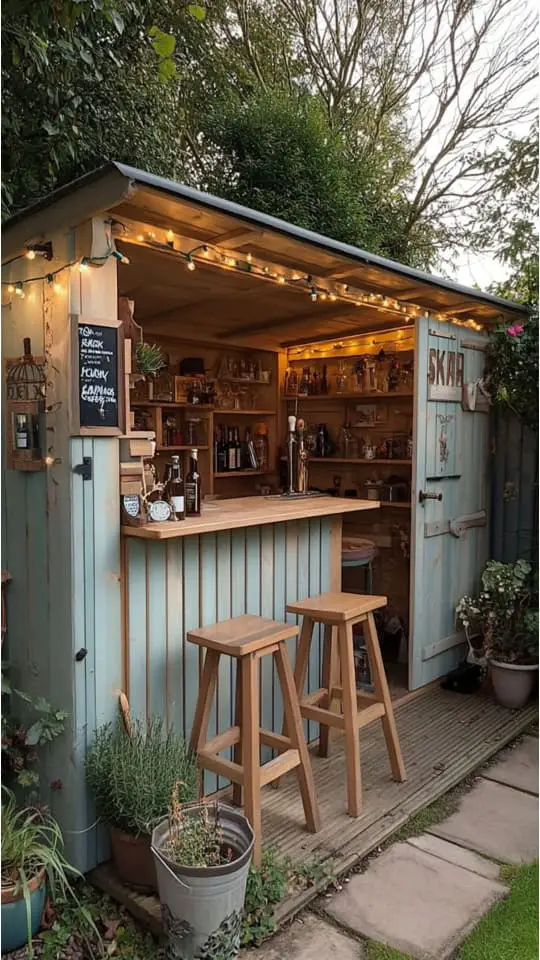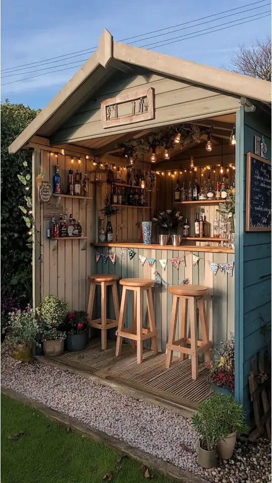 The bar shed gave me space for drinks, snacks, and fun gatherings. Matching the seating and paint colors to my garden created a cozy vibe.